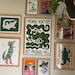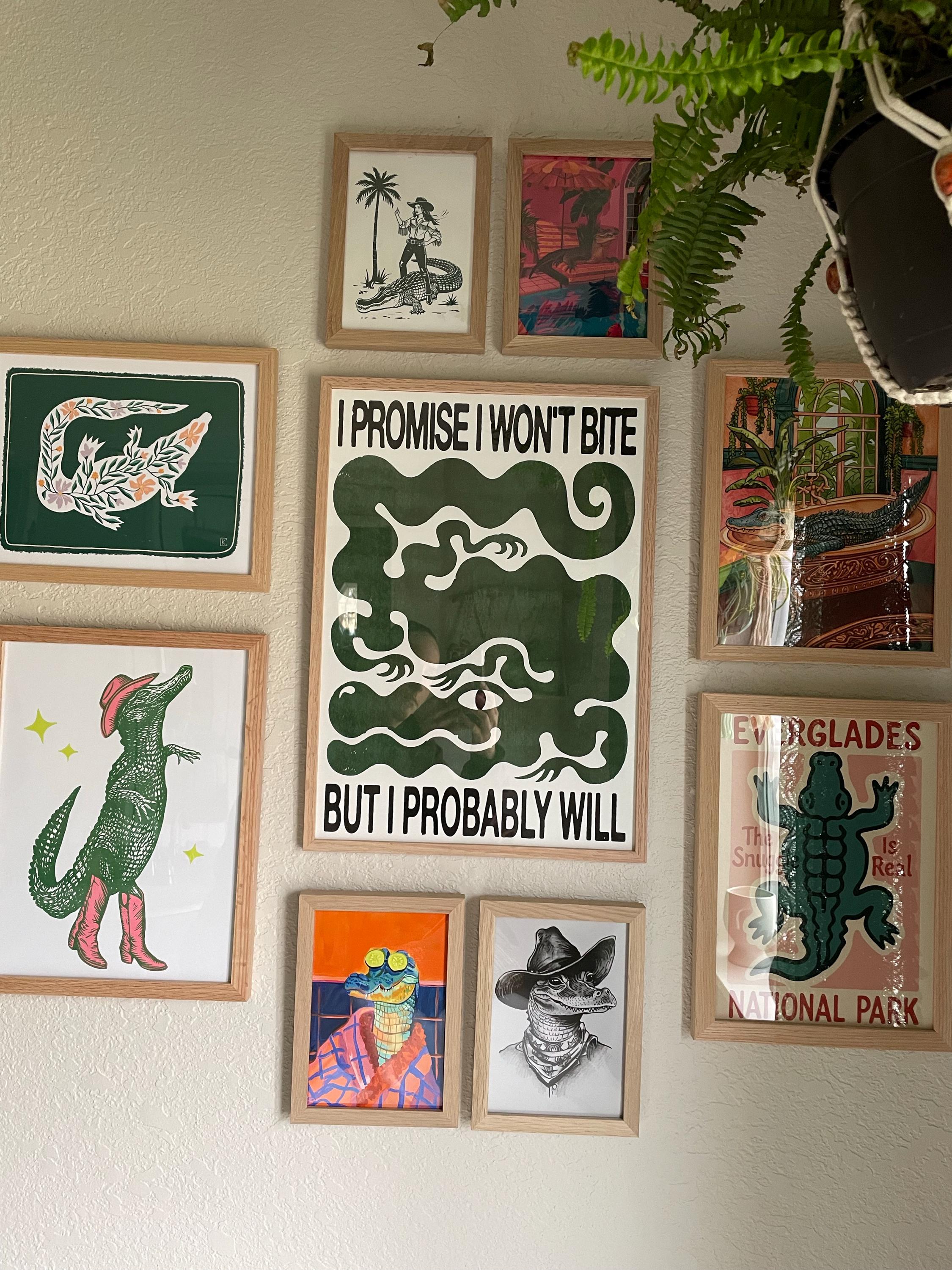 This is a 3 color, 9x12" linocut print of a very sassy alligator in a pink cowboy hat and boots!
