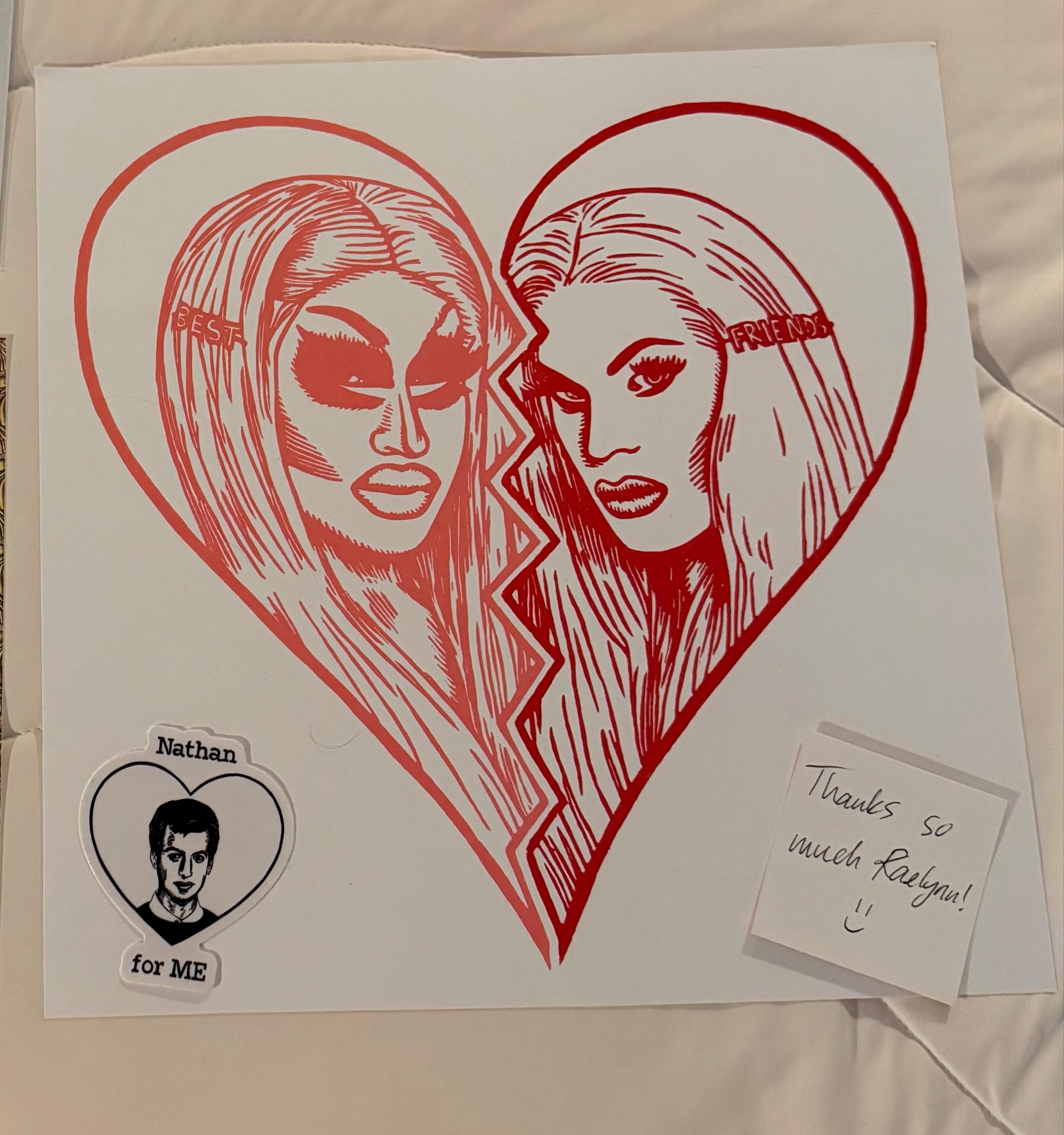 This is a 12x12", two color linocut print of the queens and legends Trixie and Katya!
