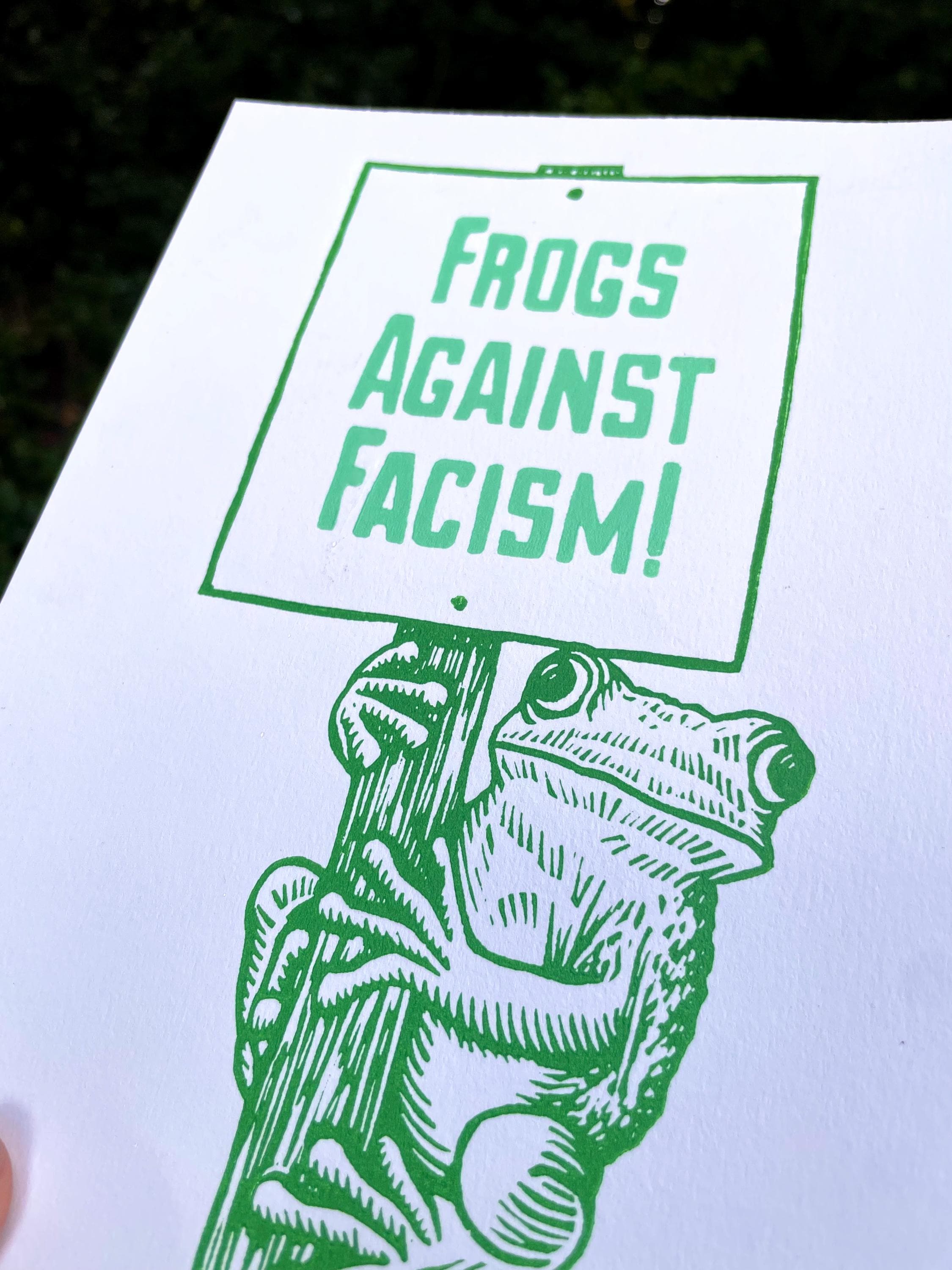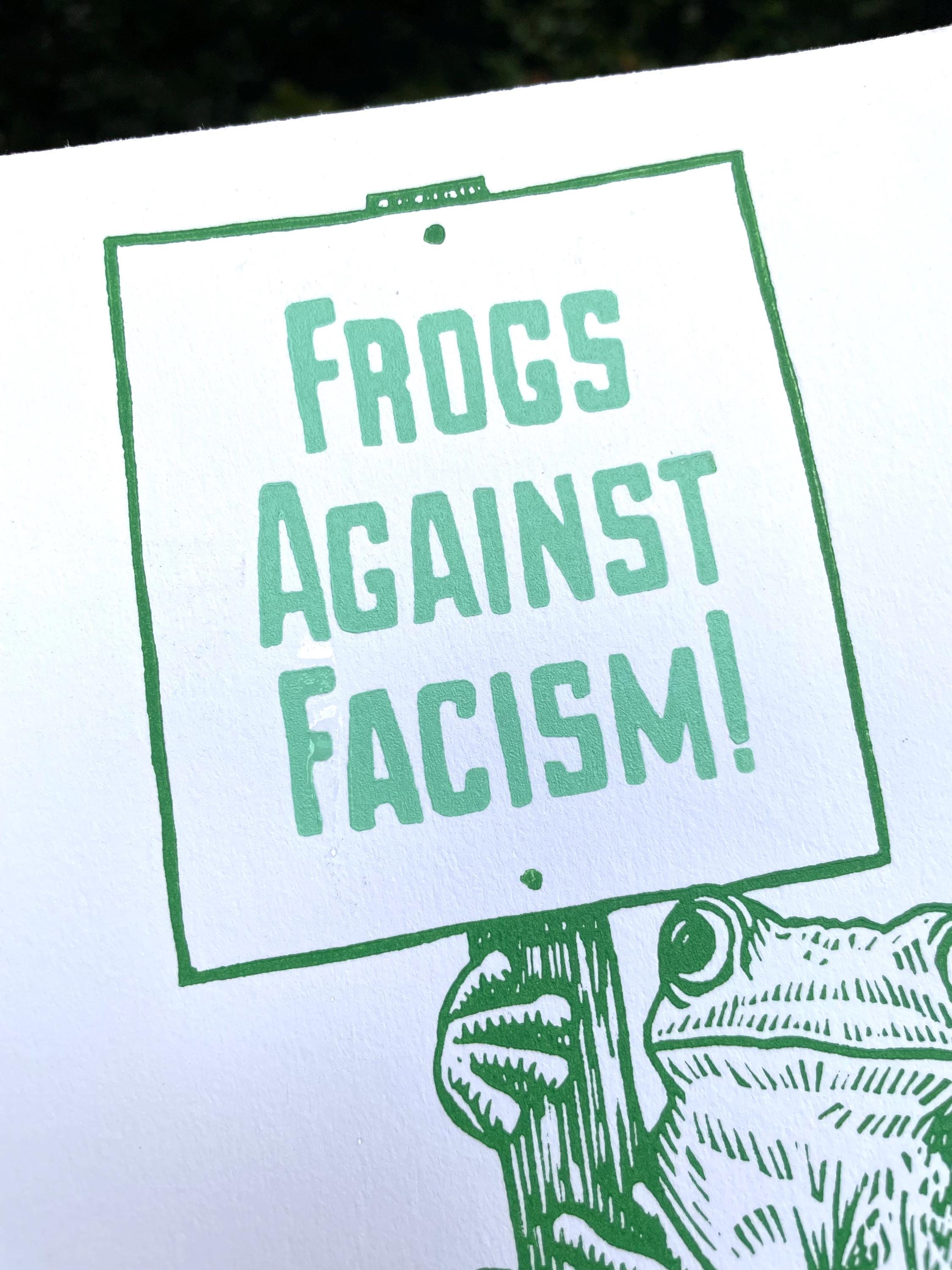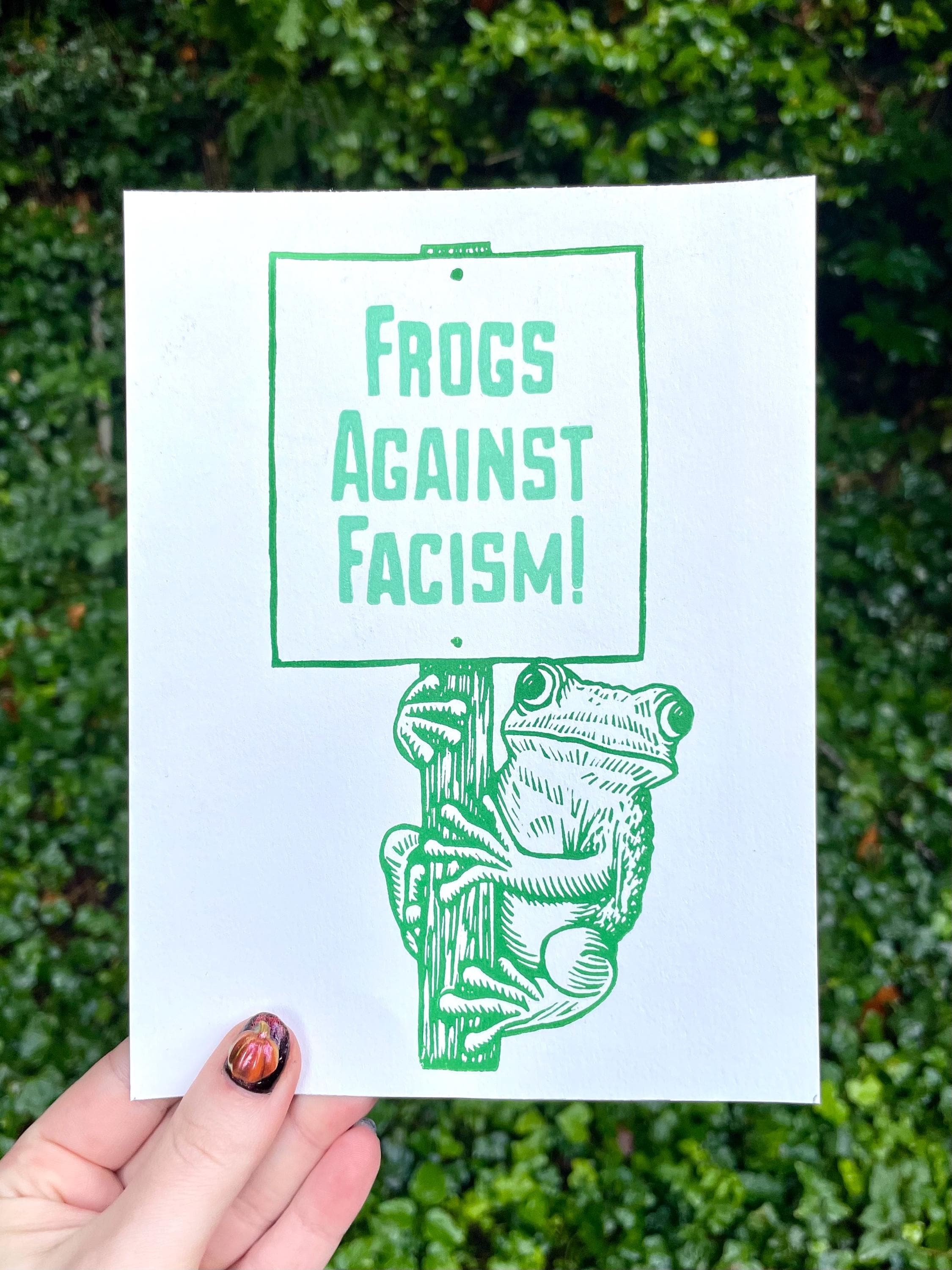 This is a 6x8, two color linocut print inspired by the Portland protesting frog! ALL PROCEEDS FROM THIS PRINT WILL BE DONATED TO THE IMMIGRANT DEFENSE PROJECT!