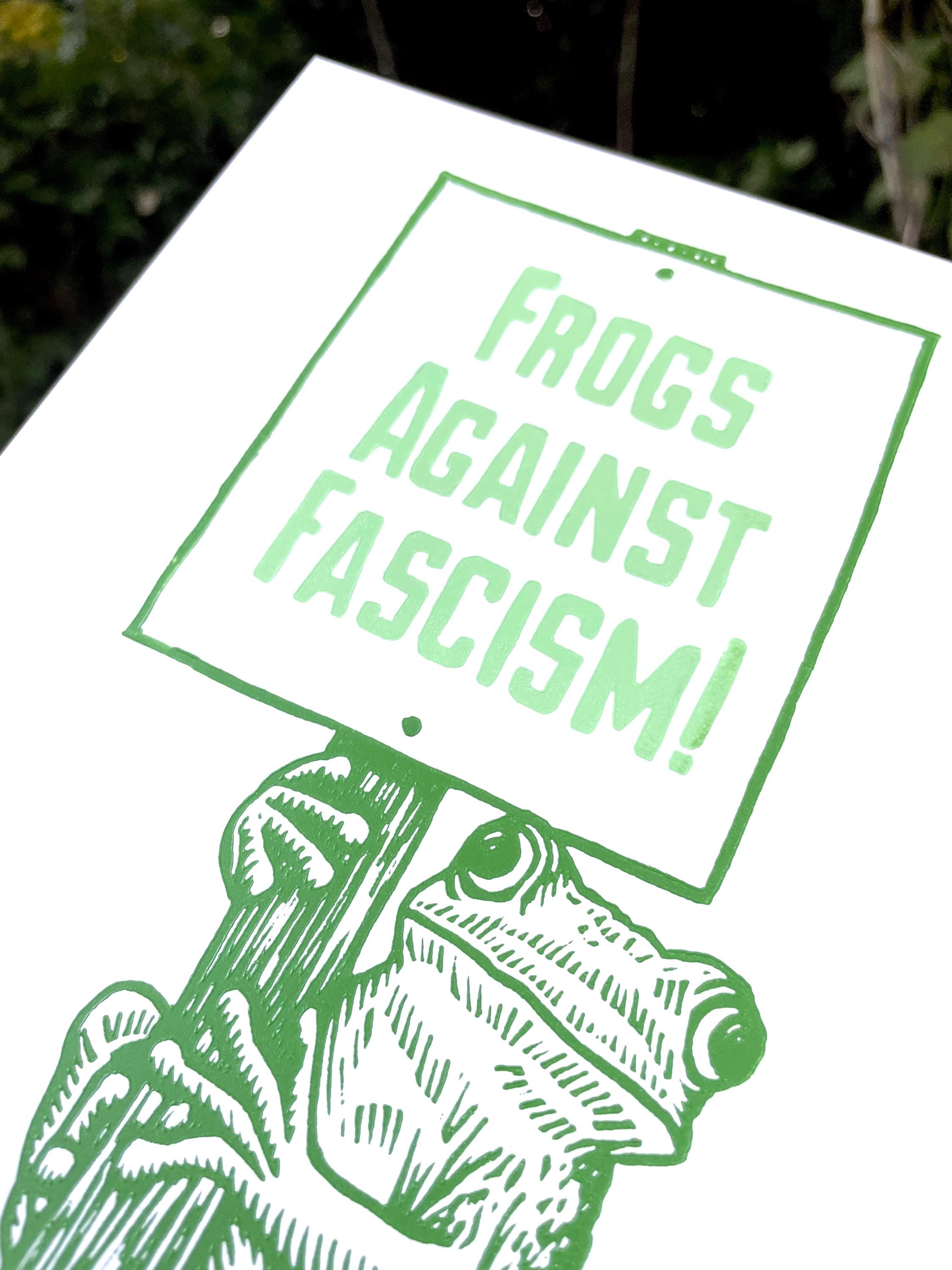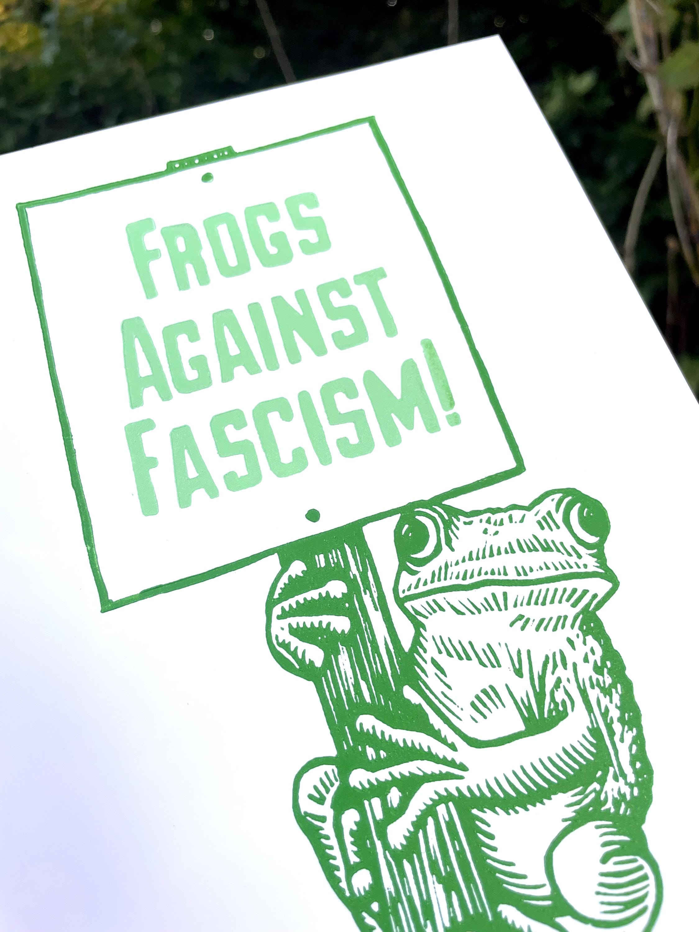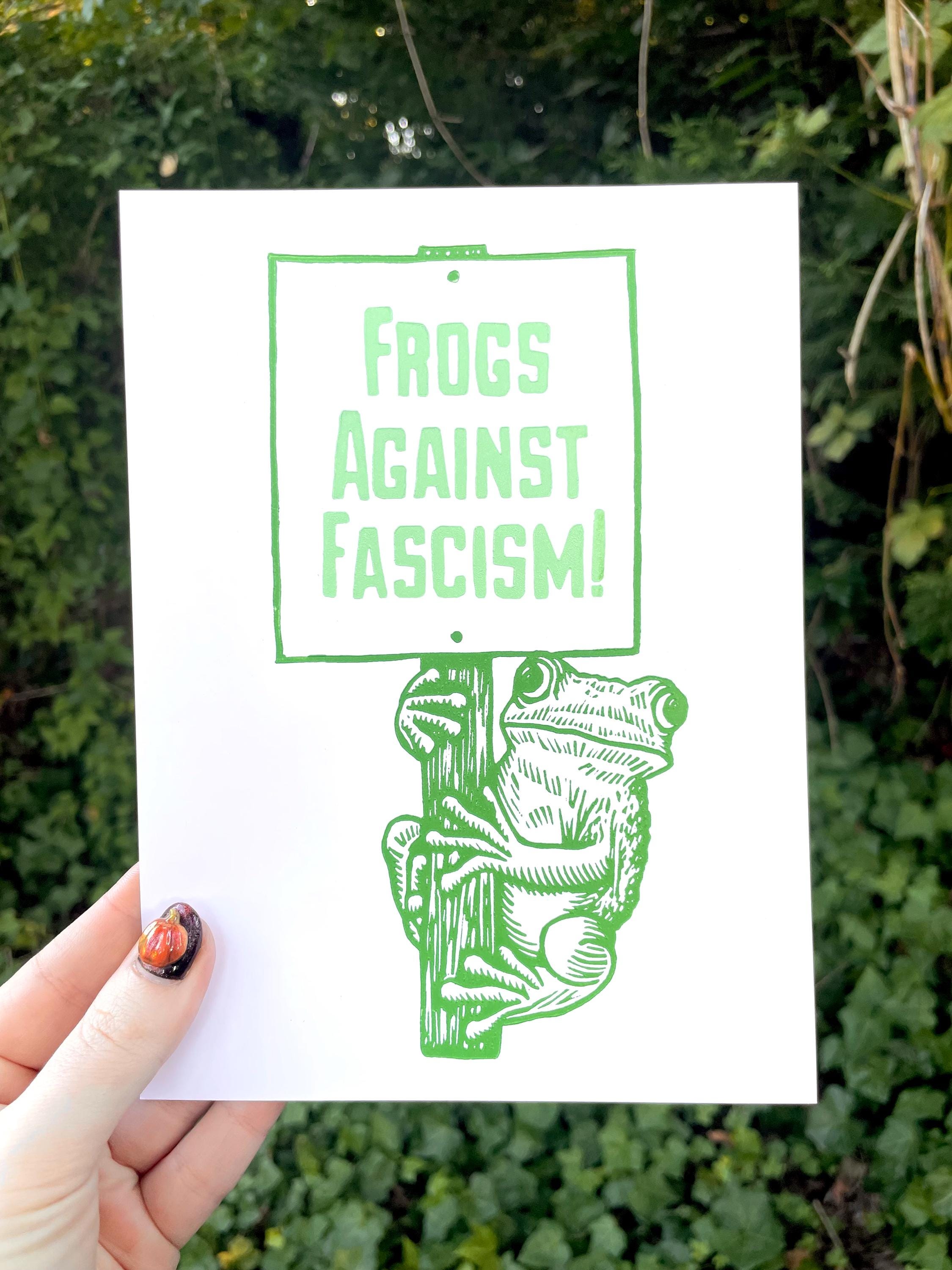 This is a 6x8, two color linocut print inspired by the Portland protesting frog! ALL PROCEEDS FROM THIS PRINT WILL BE DONATED TO THE IMMIGRANT DEFENSE PROJECT!