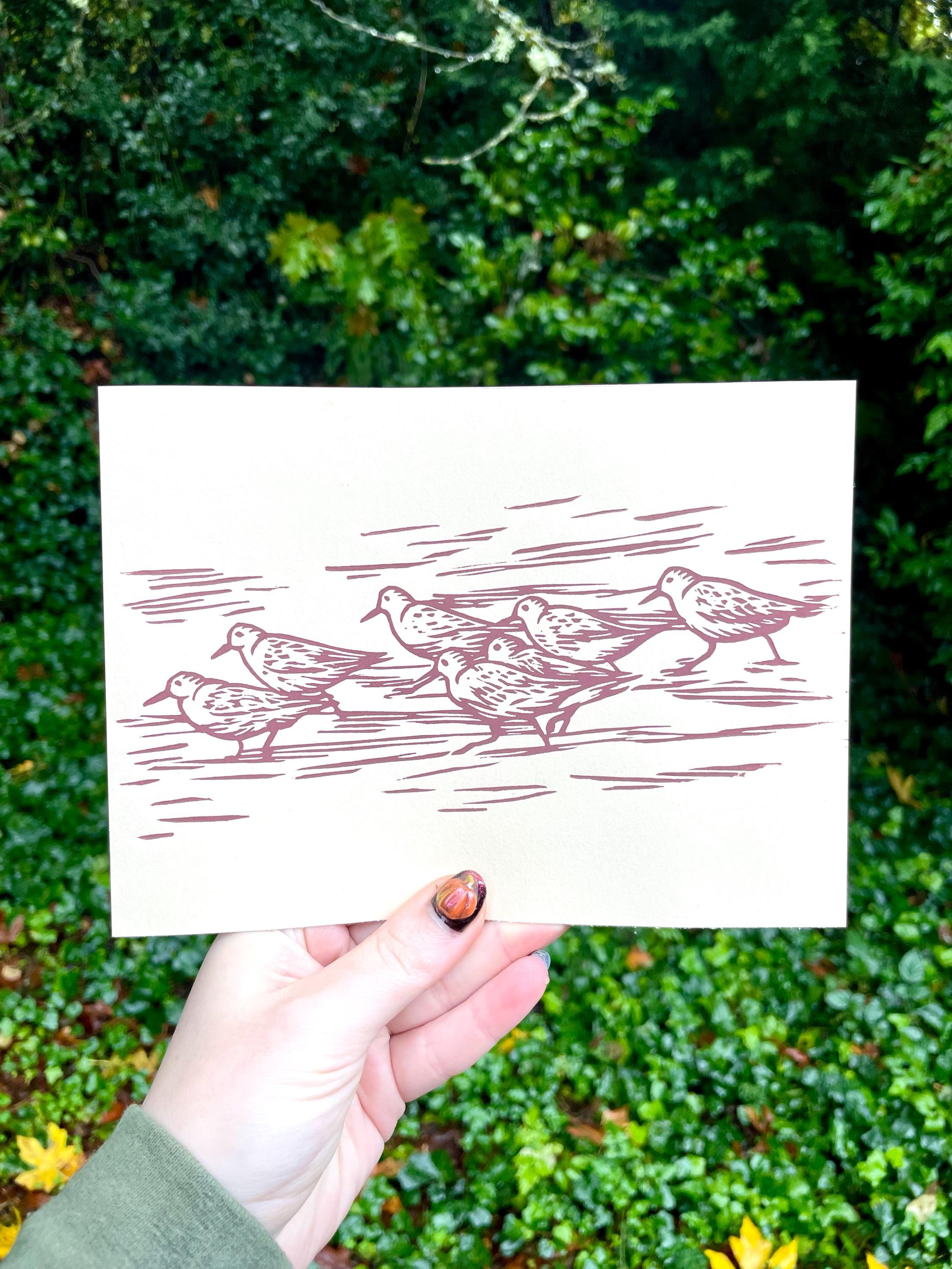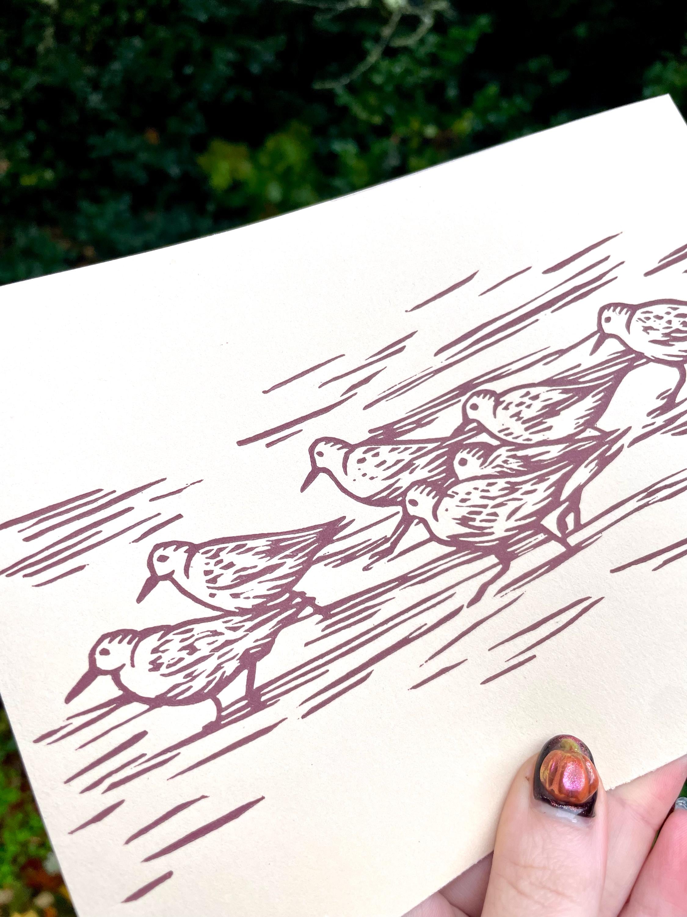 This is a 6x8" linocut print of a flock of sea birds called sanderlings! It is printed with Cranfield Caligo Safewash inks on Stonehenge paper in the color Fawn.