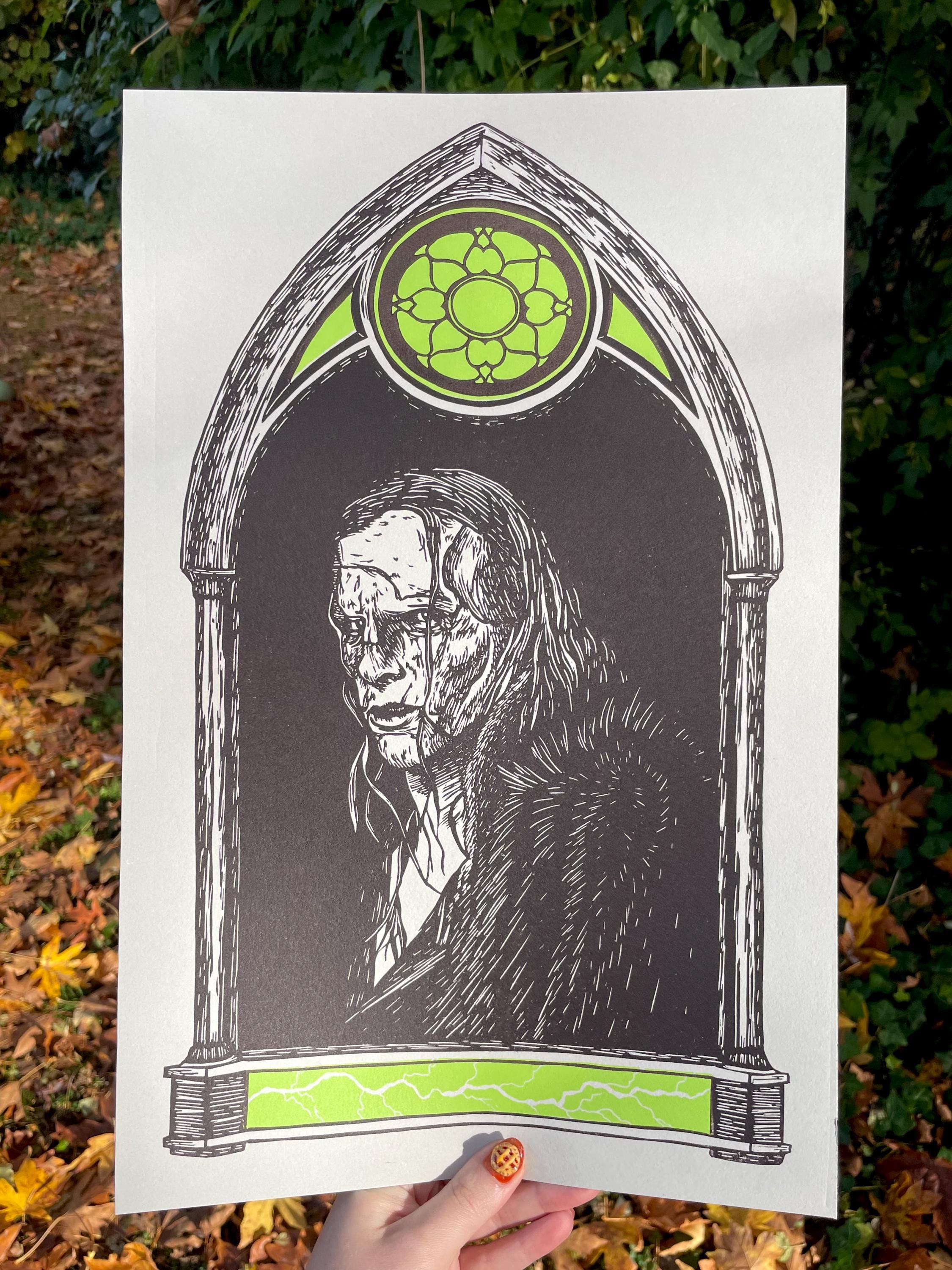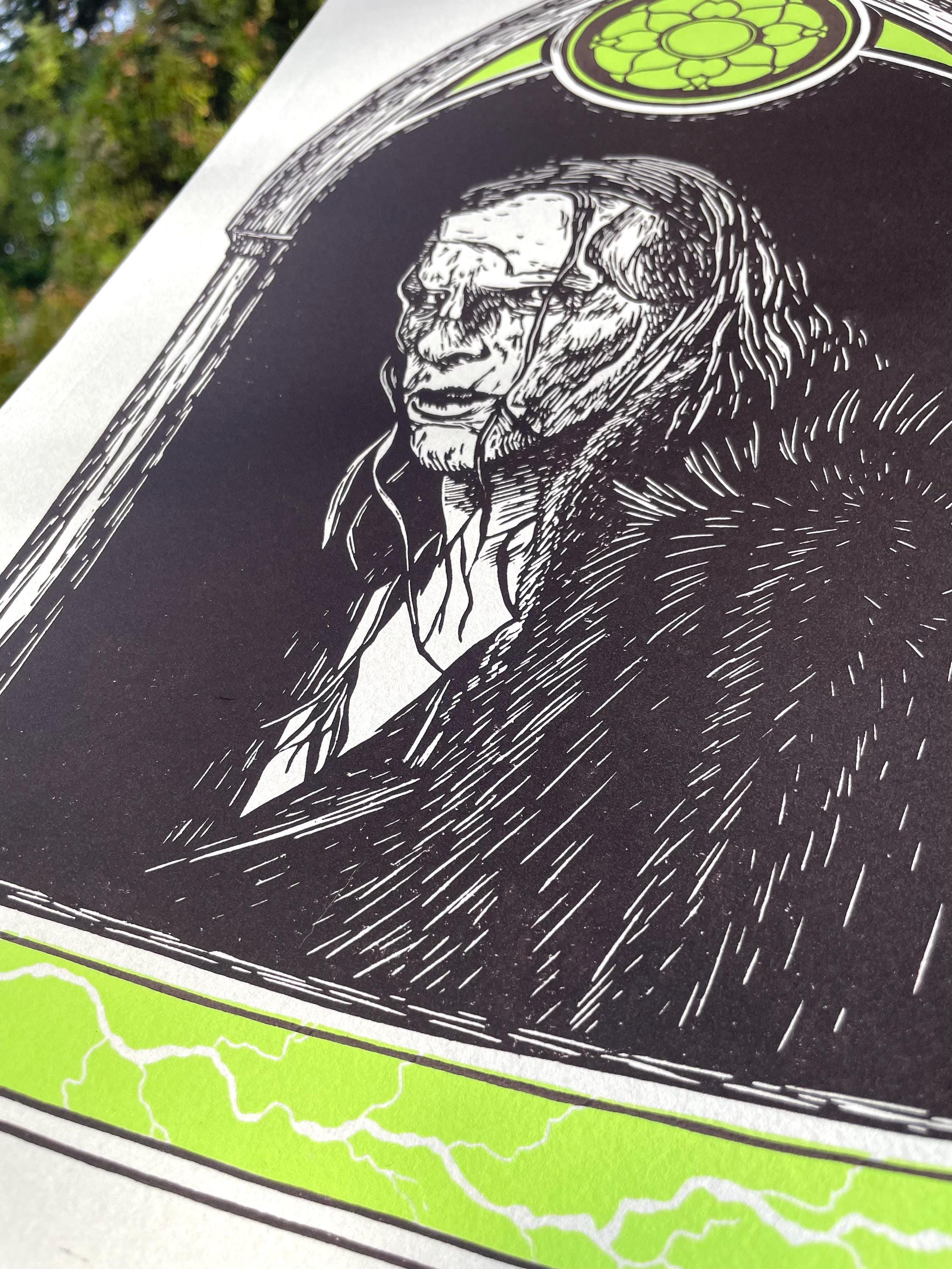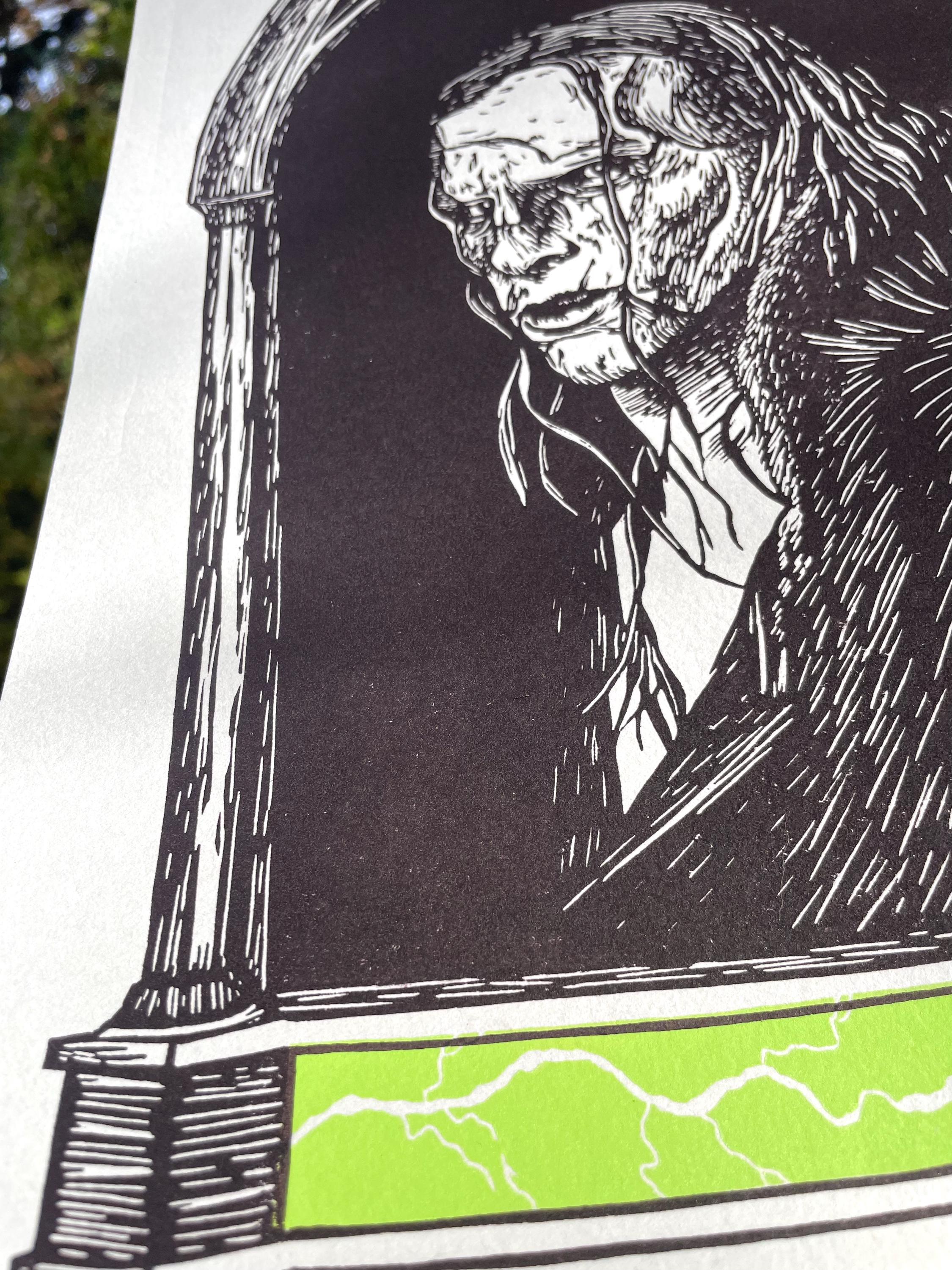This is an 11x17", two color linocut print inspired by the 2025 Frankenstein film! It is printed with Cranfield Caligo Safewash Inks on Stonehenge paper in the color Steel Gray.