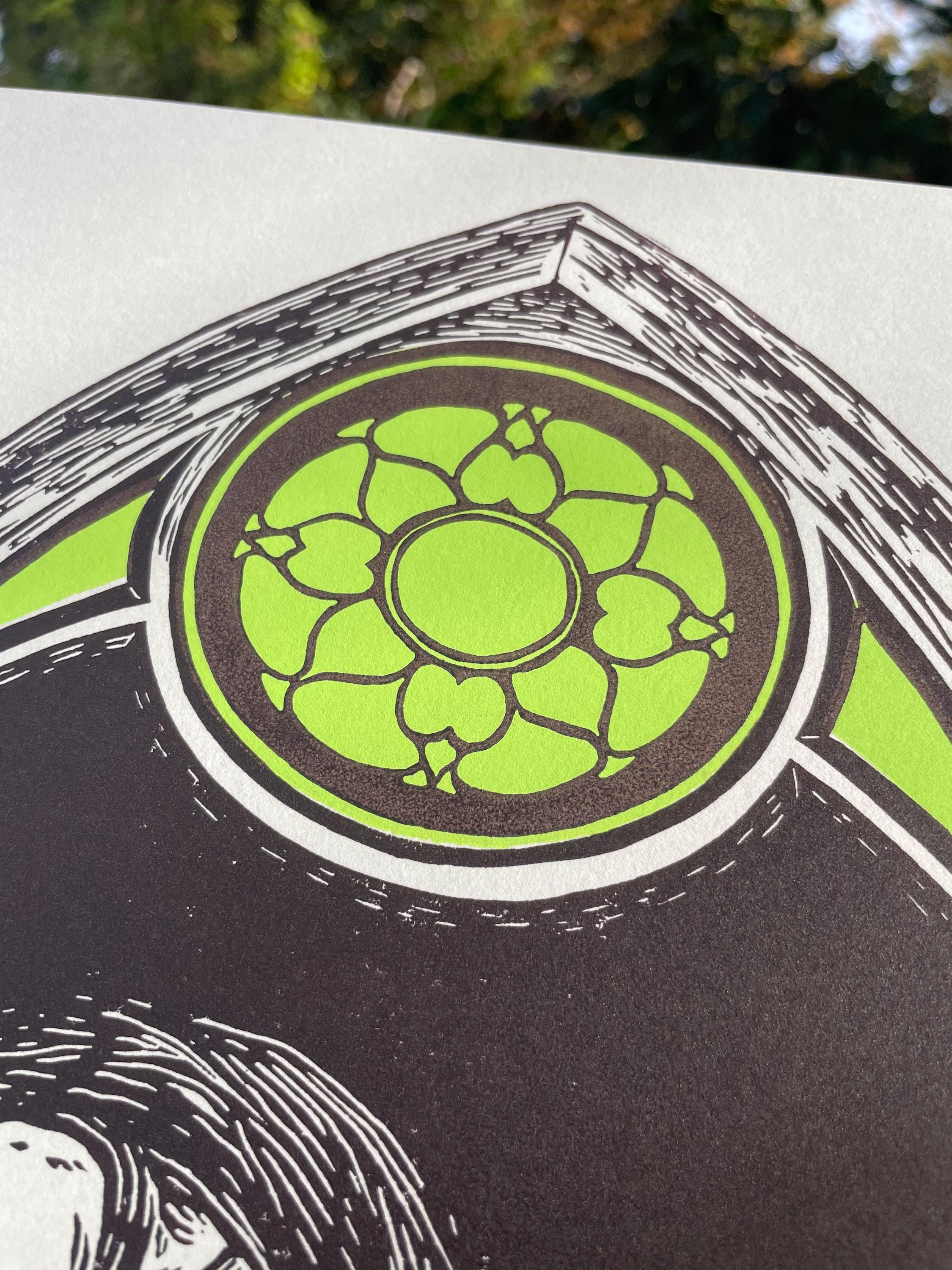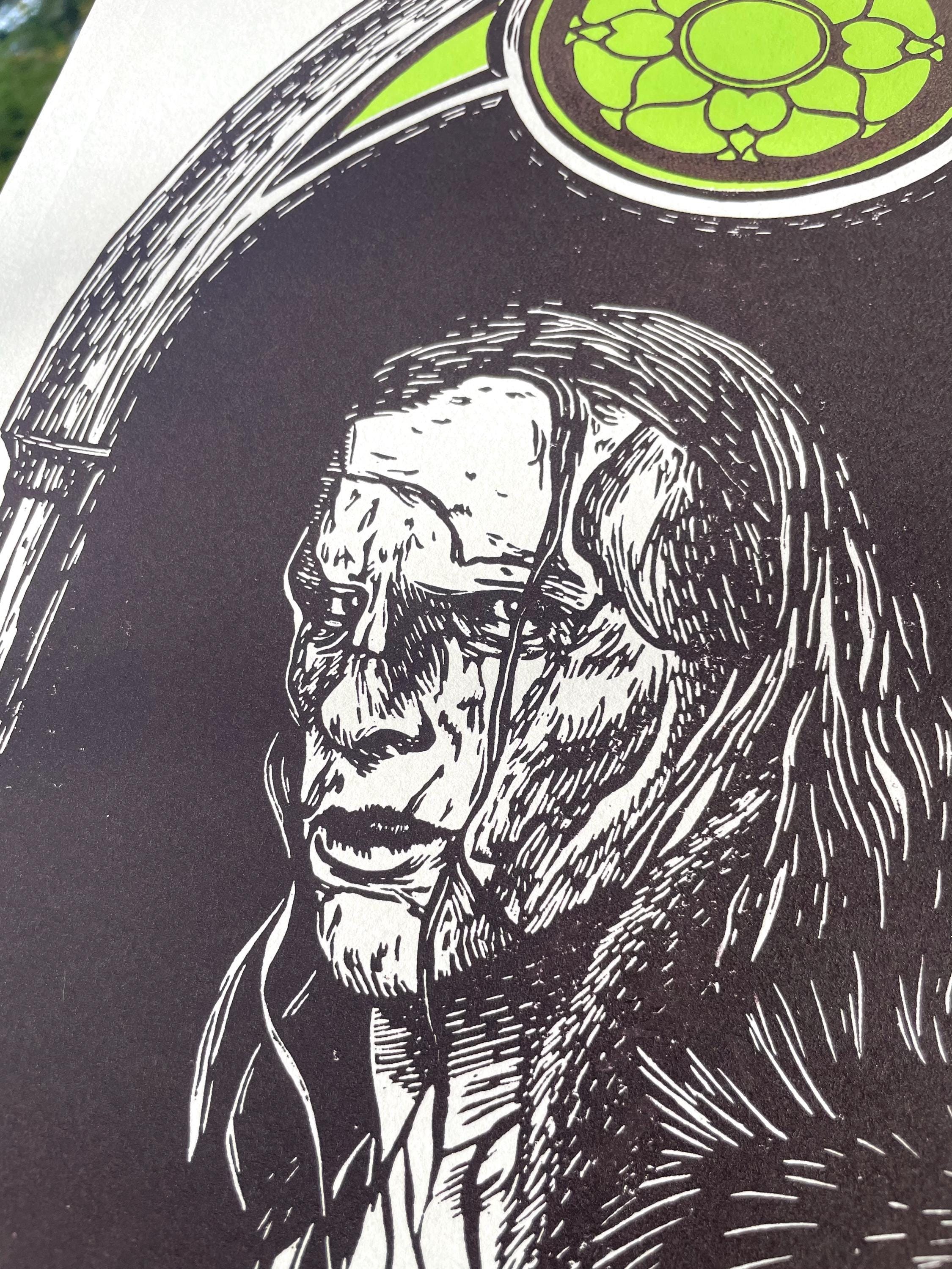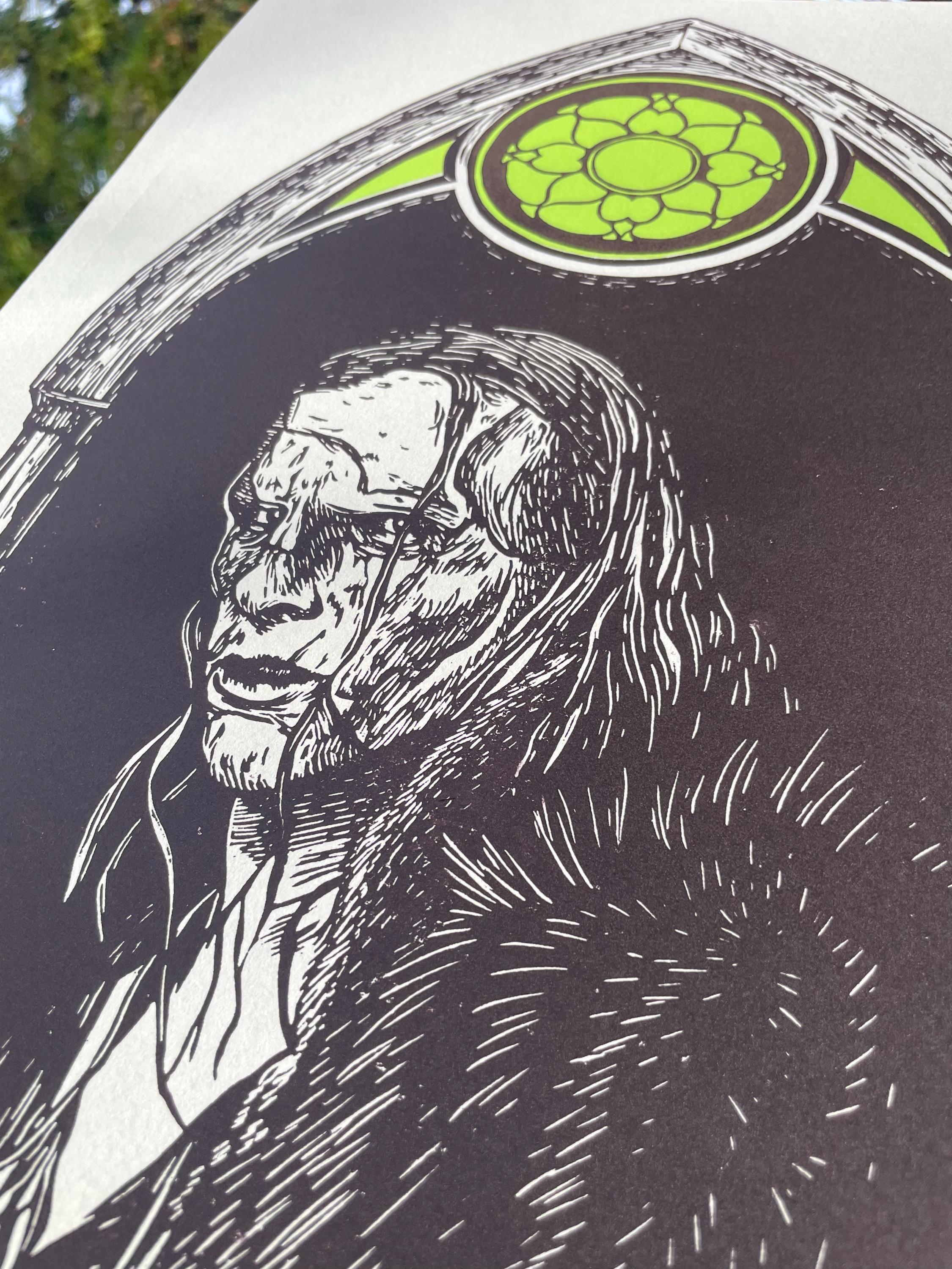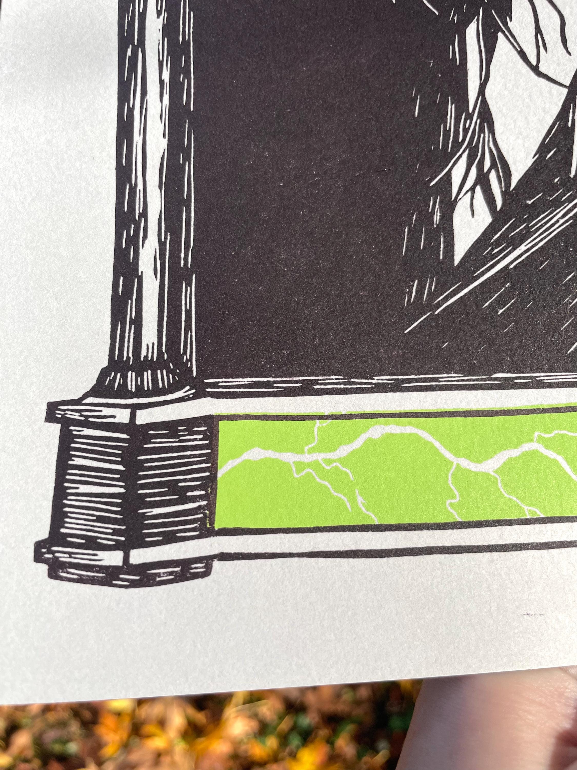 This is an 11x17", two color linocut print inspired by the 2025 Frankenstein film! It is printed with Cranfield Caligo Safewash Inks on Stonehenge paper in the color Steel Gray.
