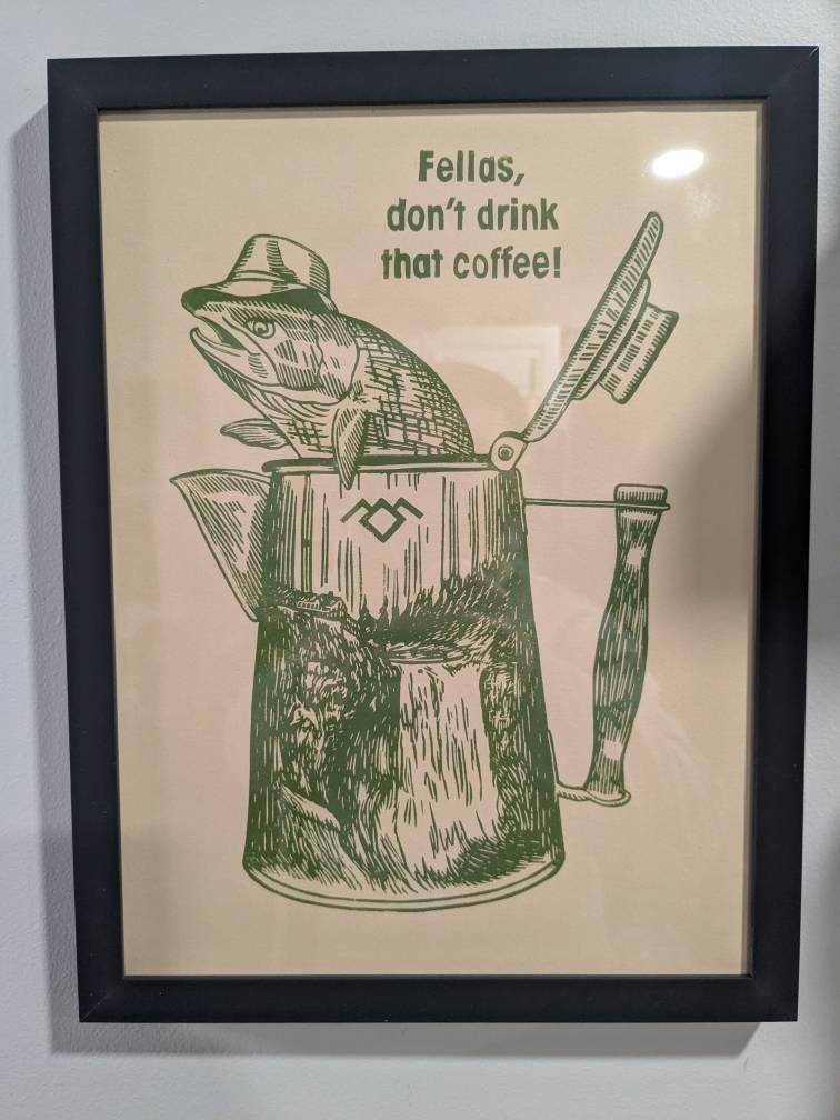 This is a 9x12" linocut print of a fish in a percolator saying "Fellas, don't drink that coffee!" It's a reference to Twin Peaks if you're unfamiliar! It's printed with Cranfield Caligo Safewash inks on Stonehenge paper in the color Fawn.