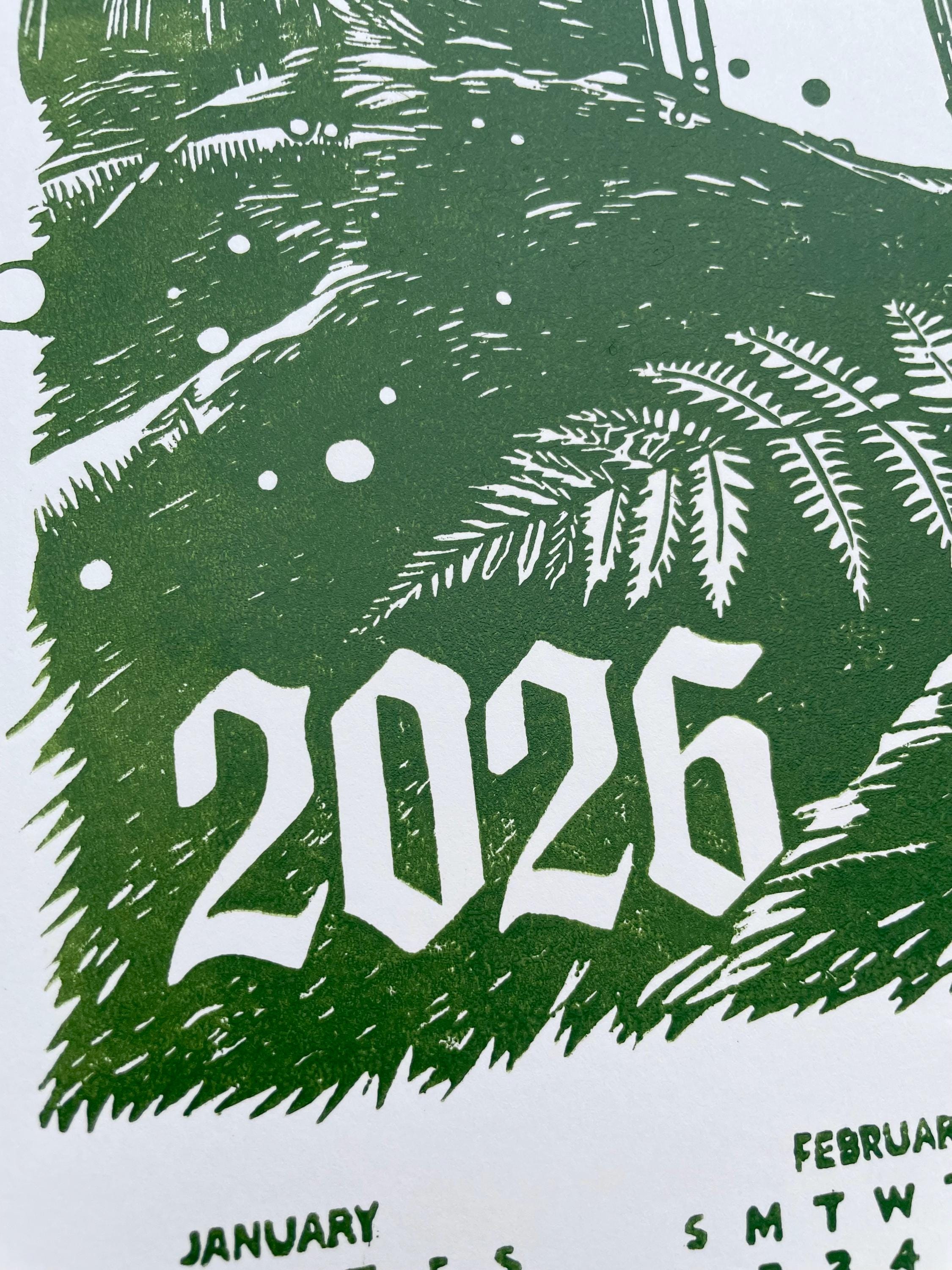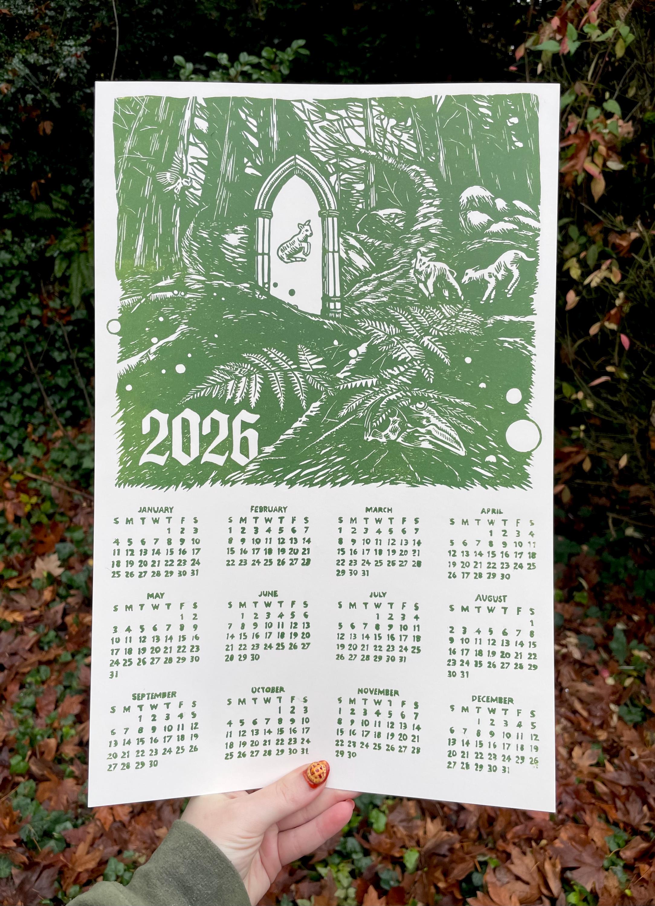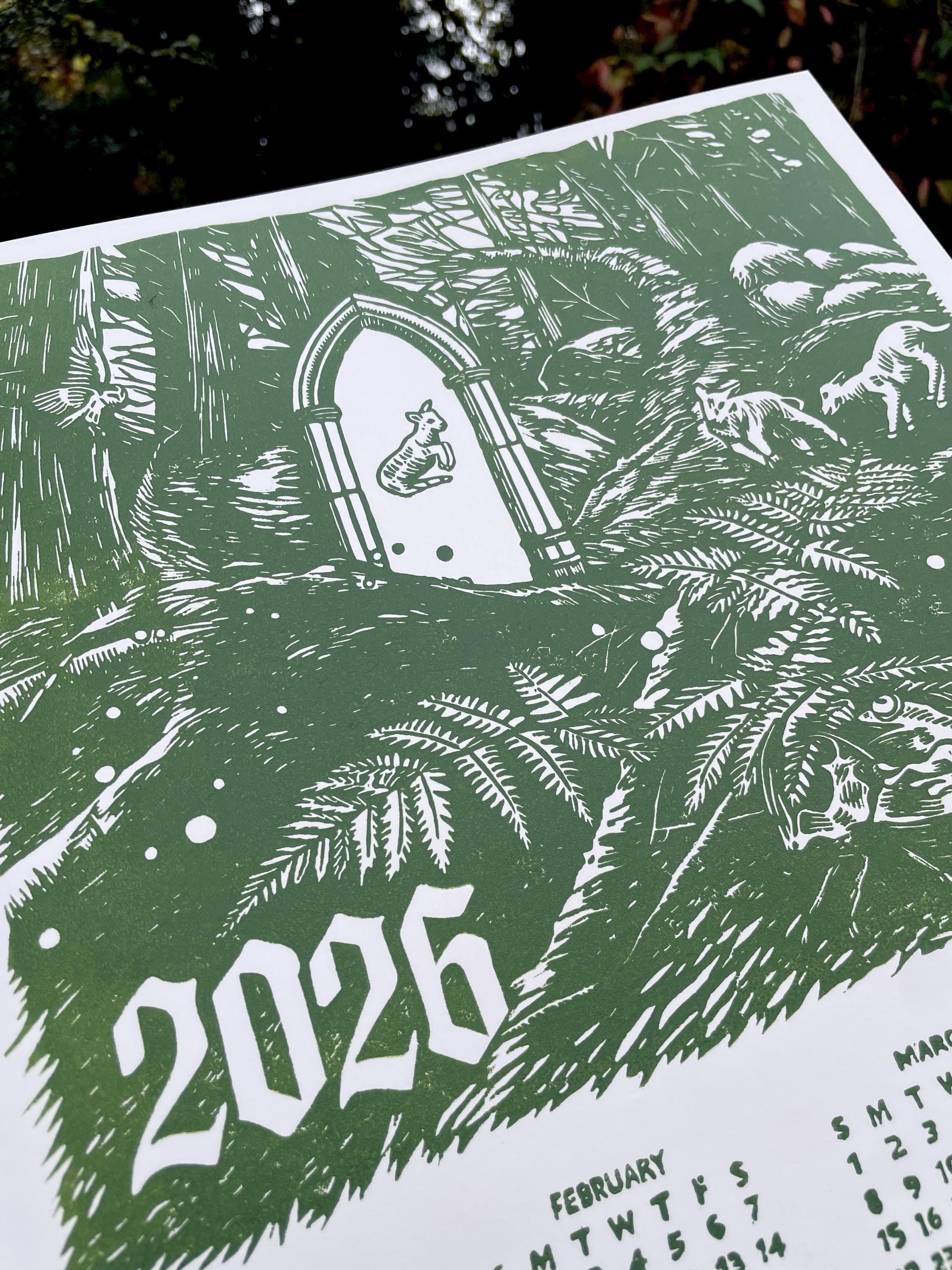 This is an 11x17" linocut printed single sheet 2026 calendar. This year's theme is a magical forest!