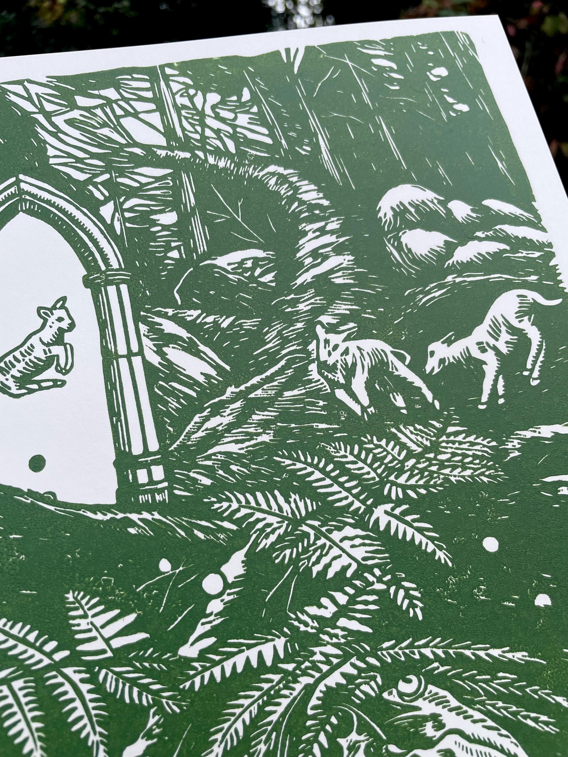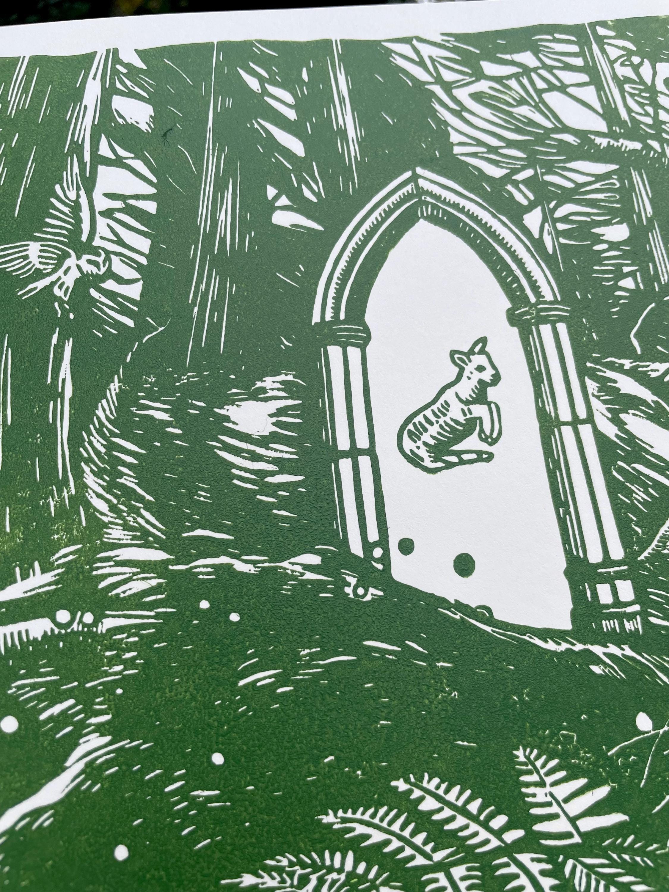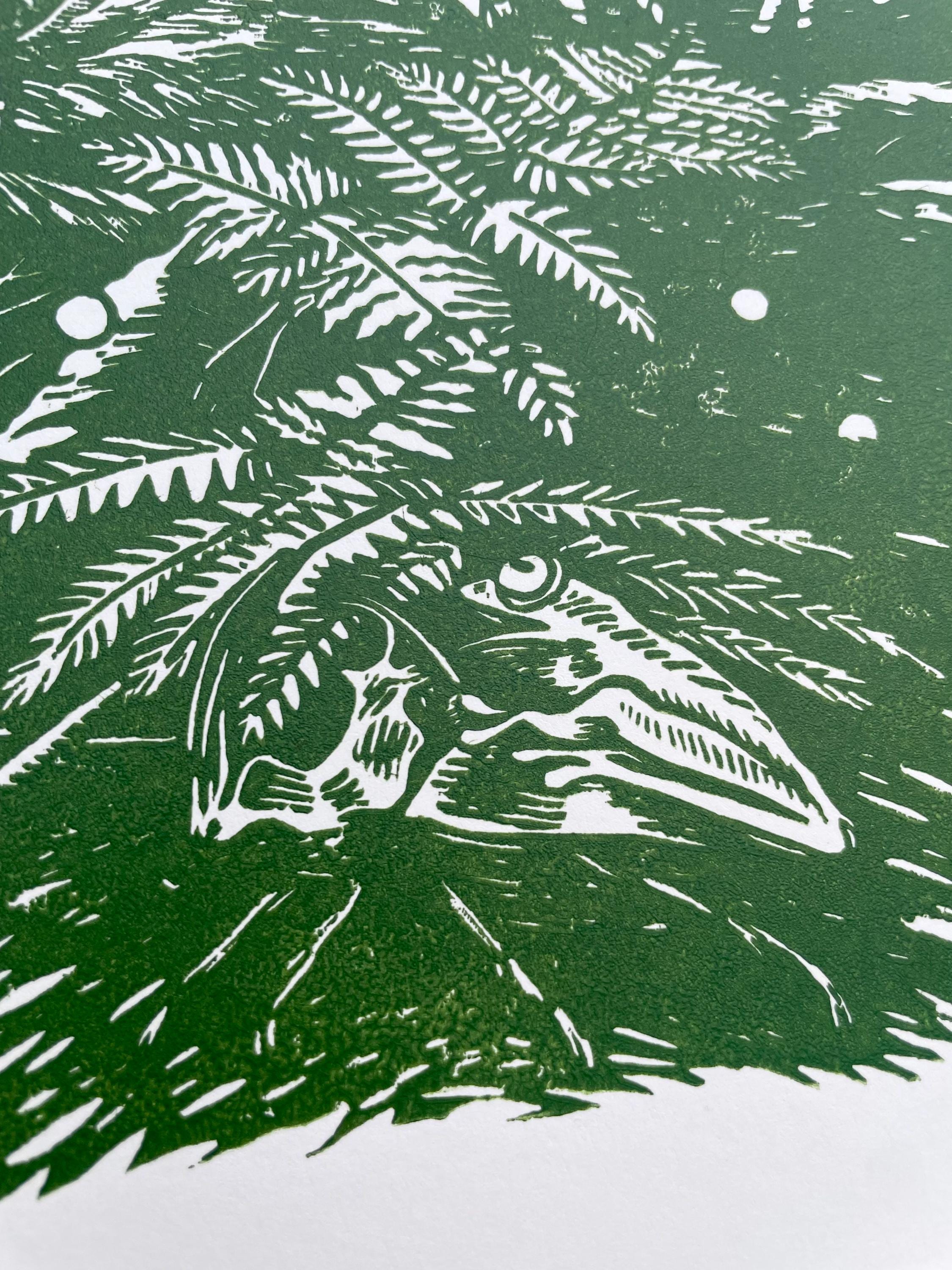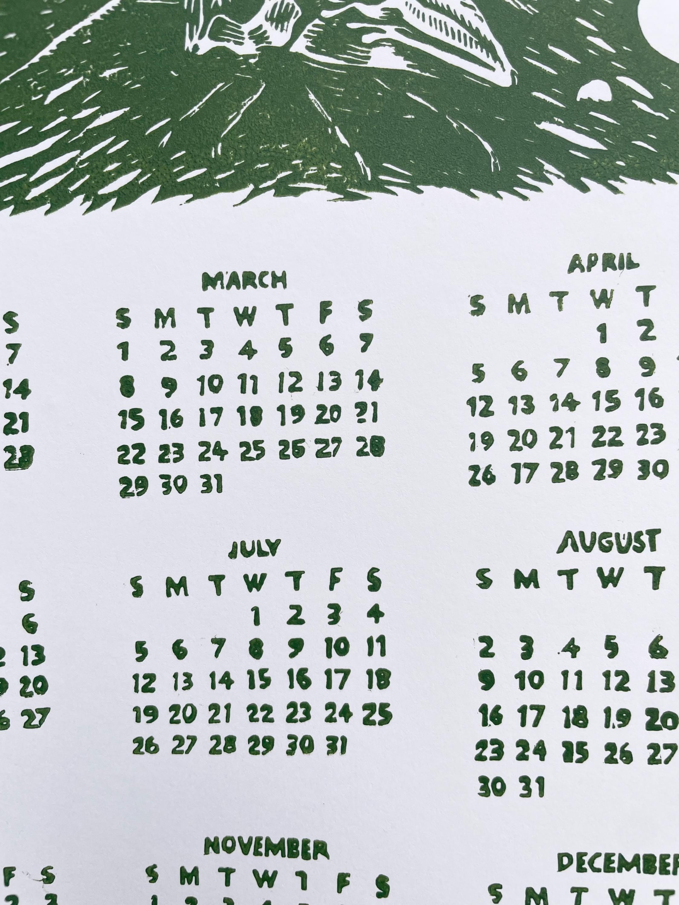 This is an 11x17" linocut printed single sheet 2026 calendar. This year's theme is a magical forest!