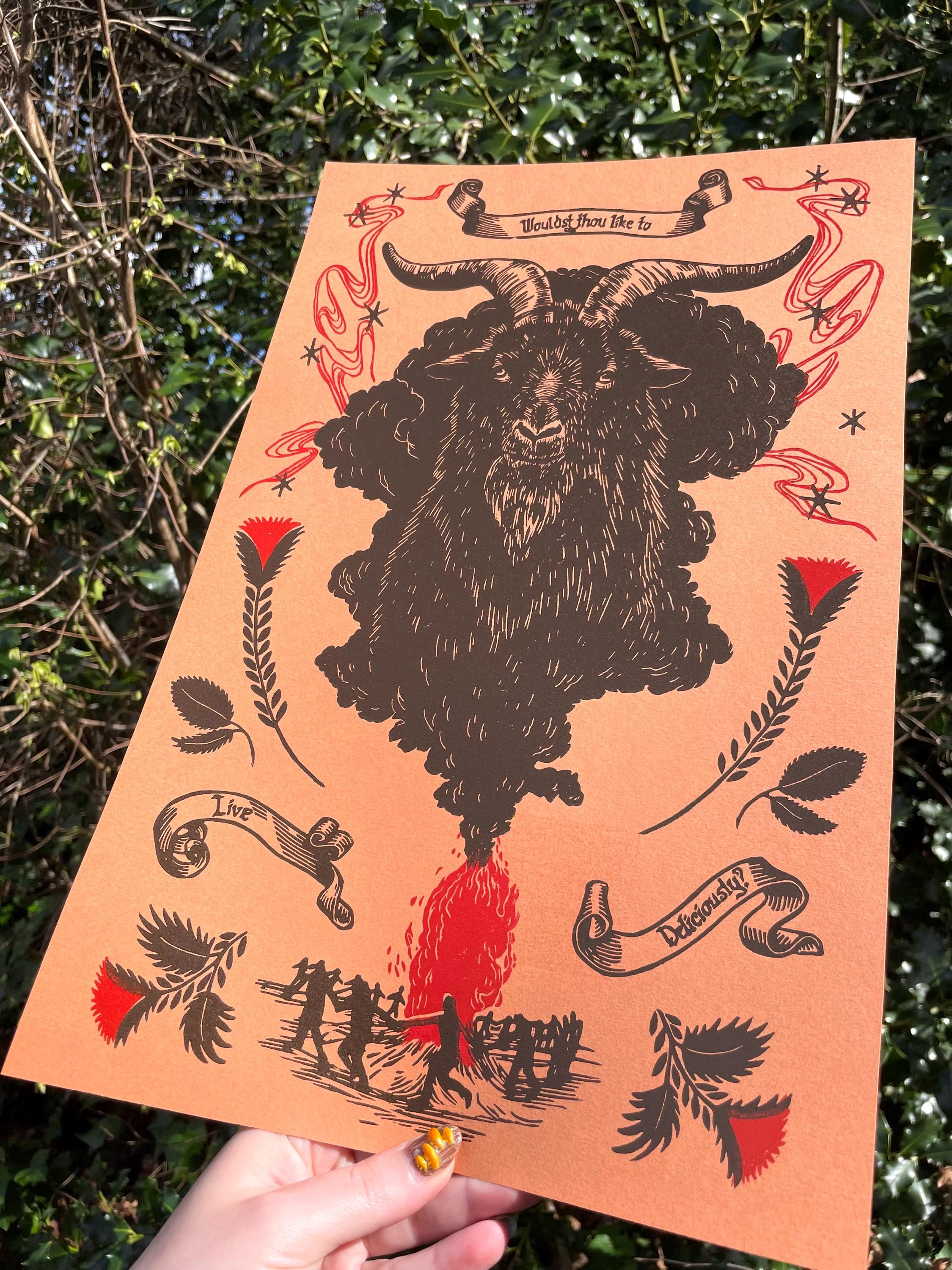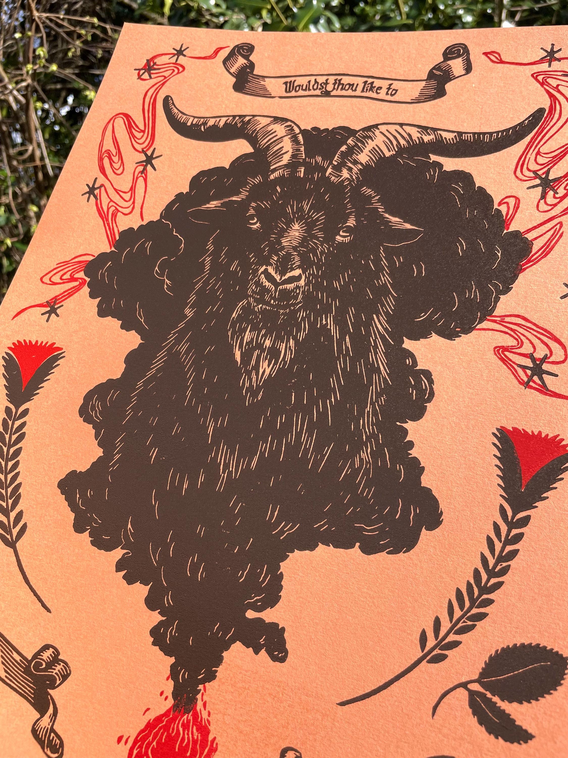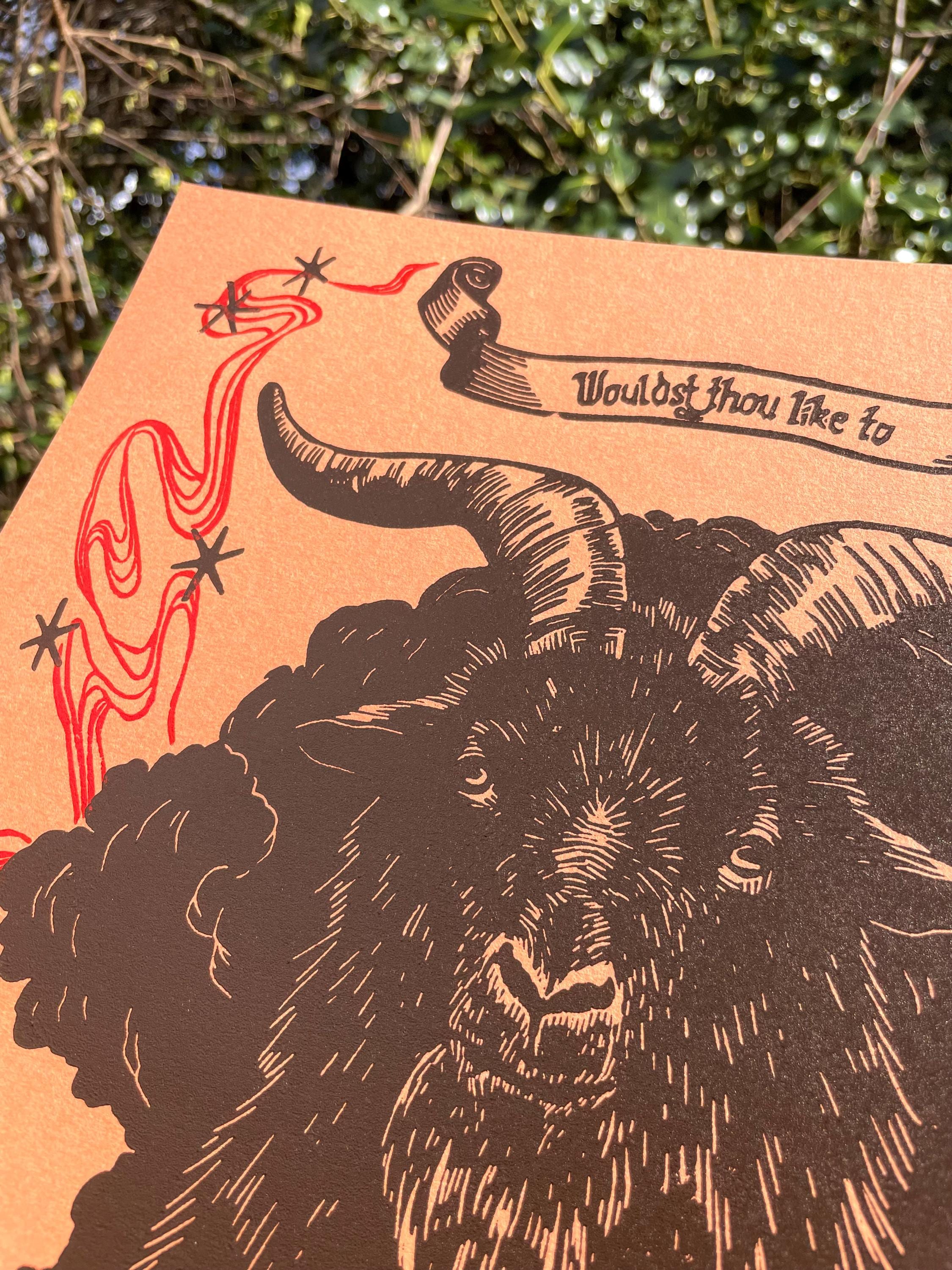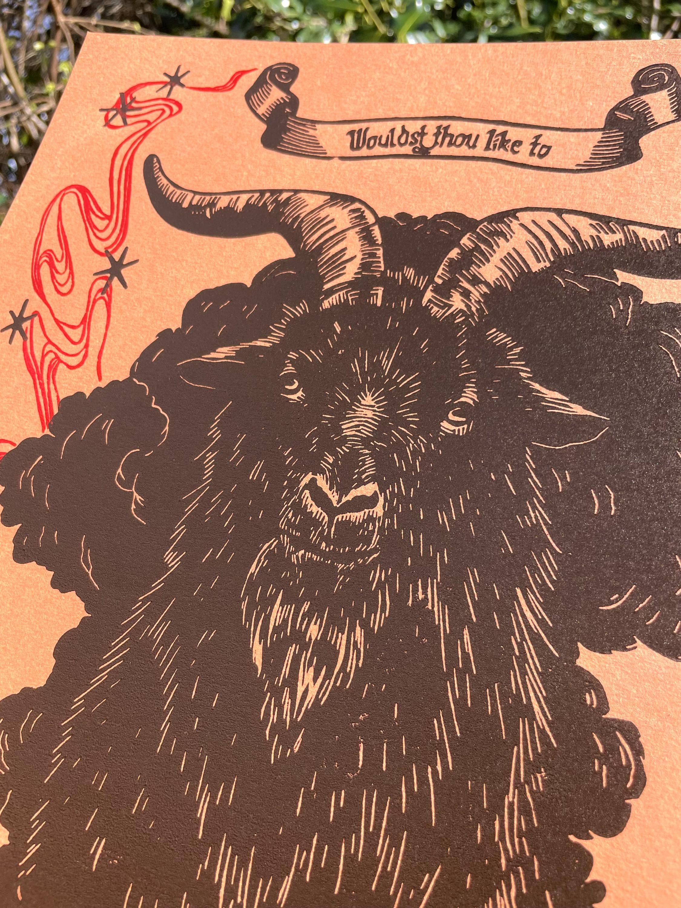 This is a 2 color, 11x17" linocut print of Black Phillip printed with Crainfield Caligo Safewash inks on Canson Mi-Teintes paper in the color Cinnamon.