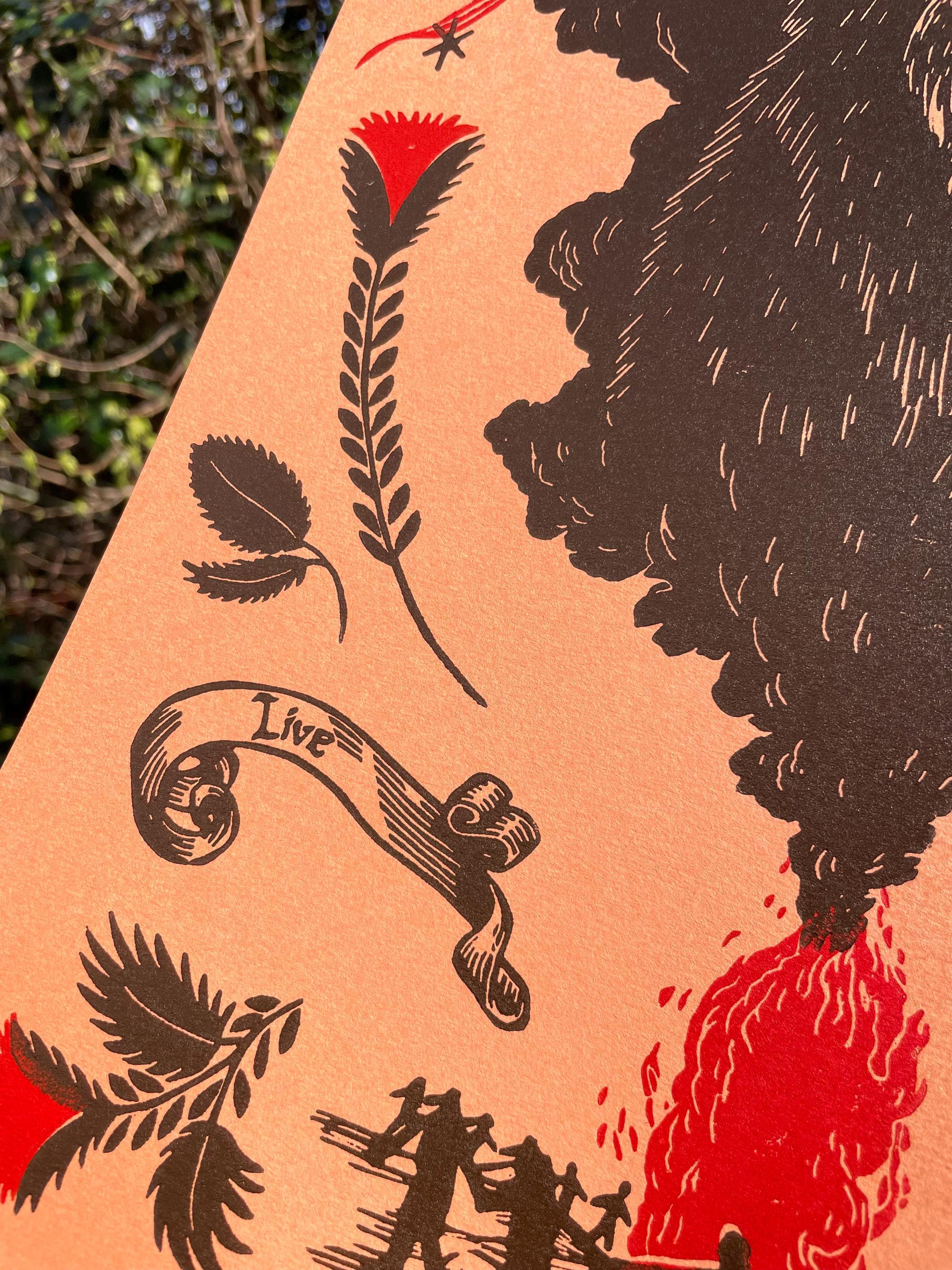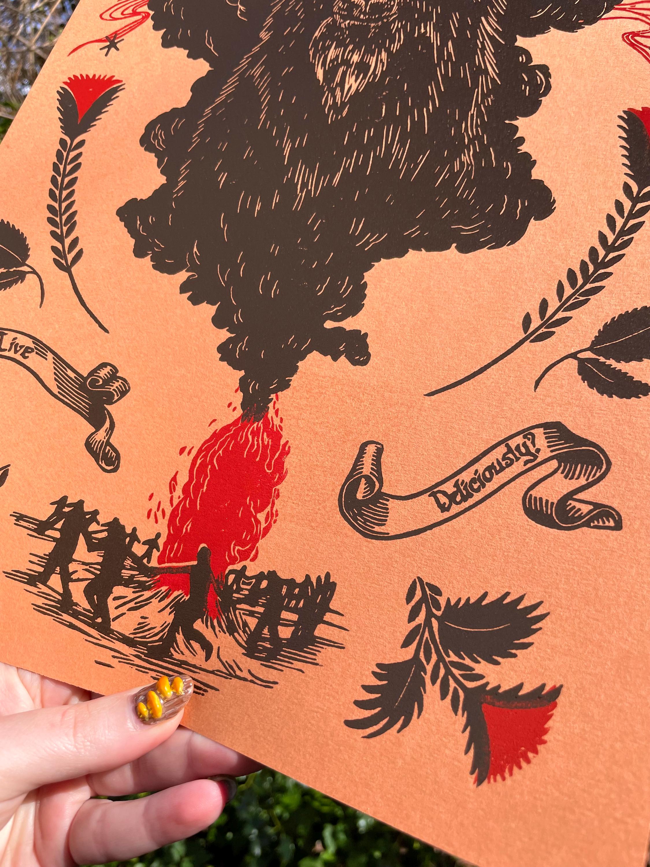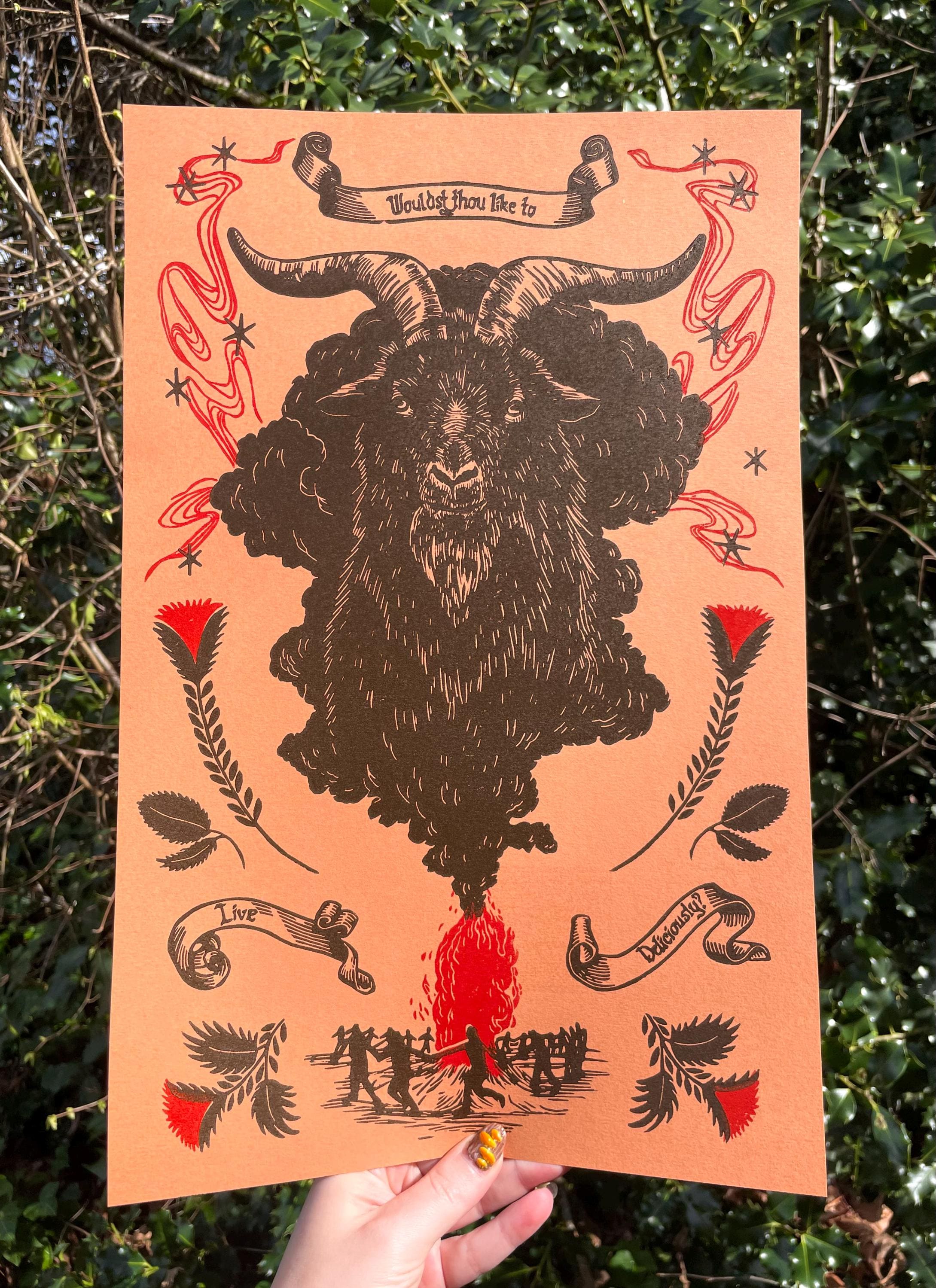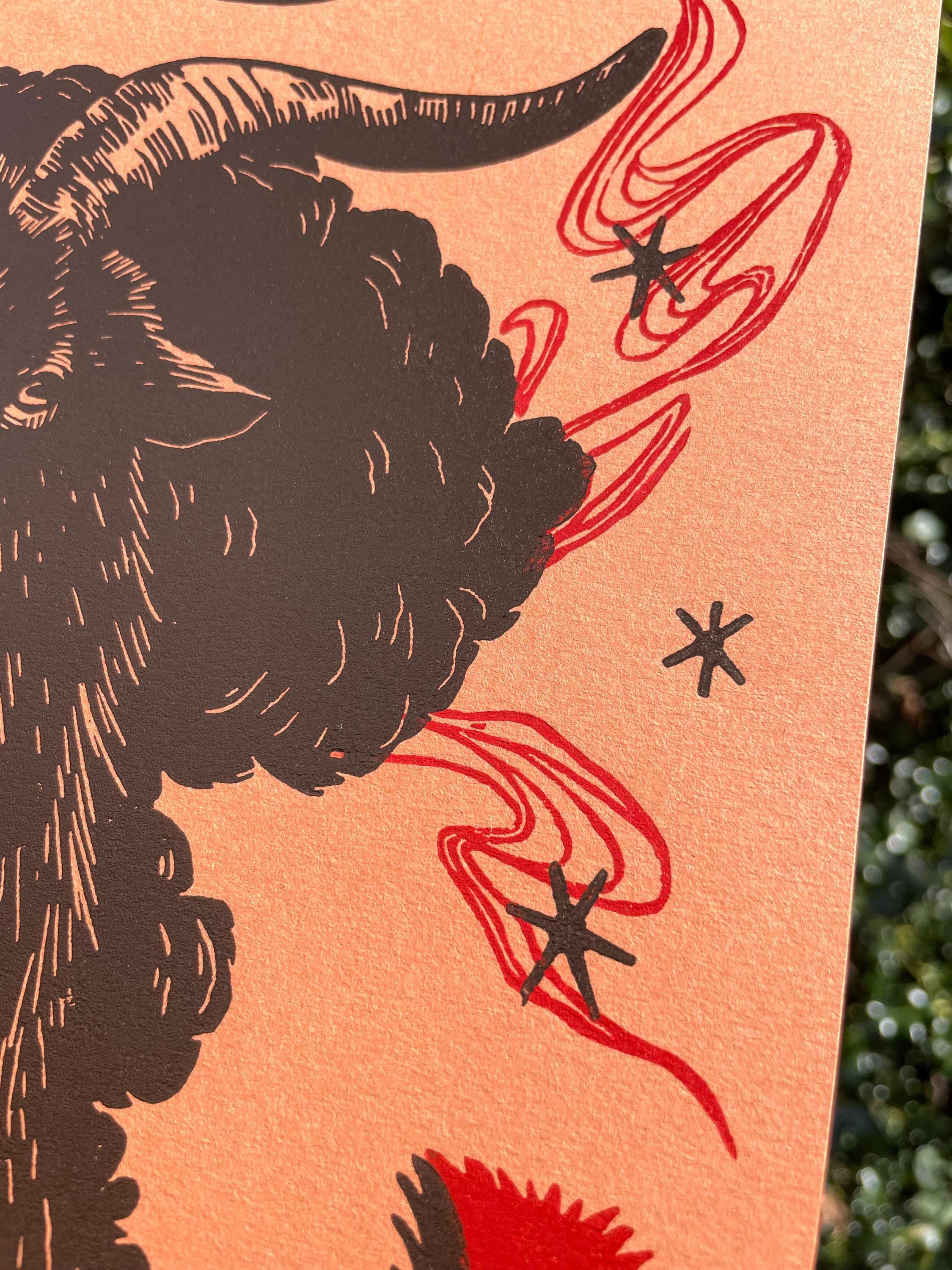 This is a 2 color, 11x17" linocut print of Black Phillip printed with Crainfield Caligo Safewash inks on Canson Mi-Teintes paper in the color Cinnamon.