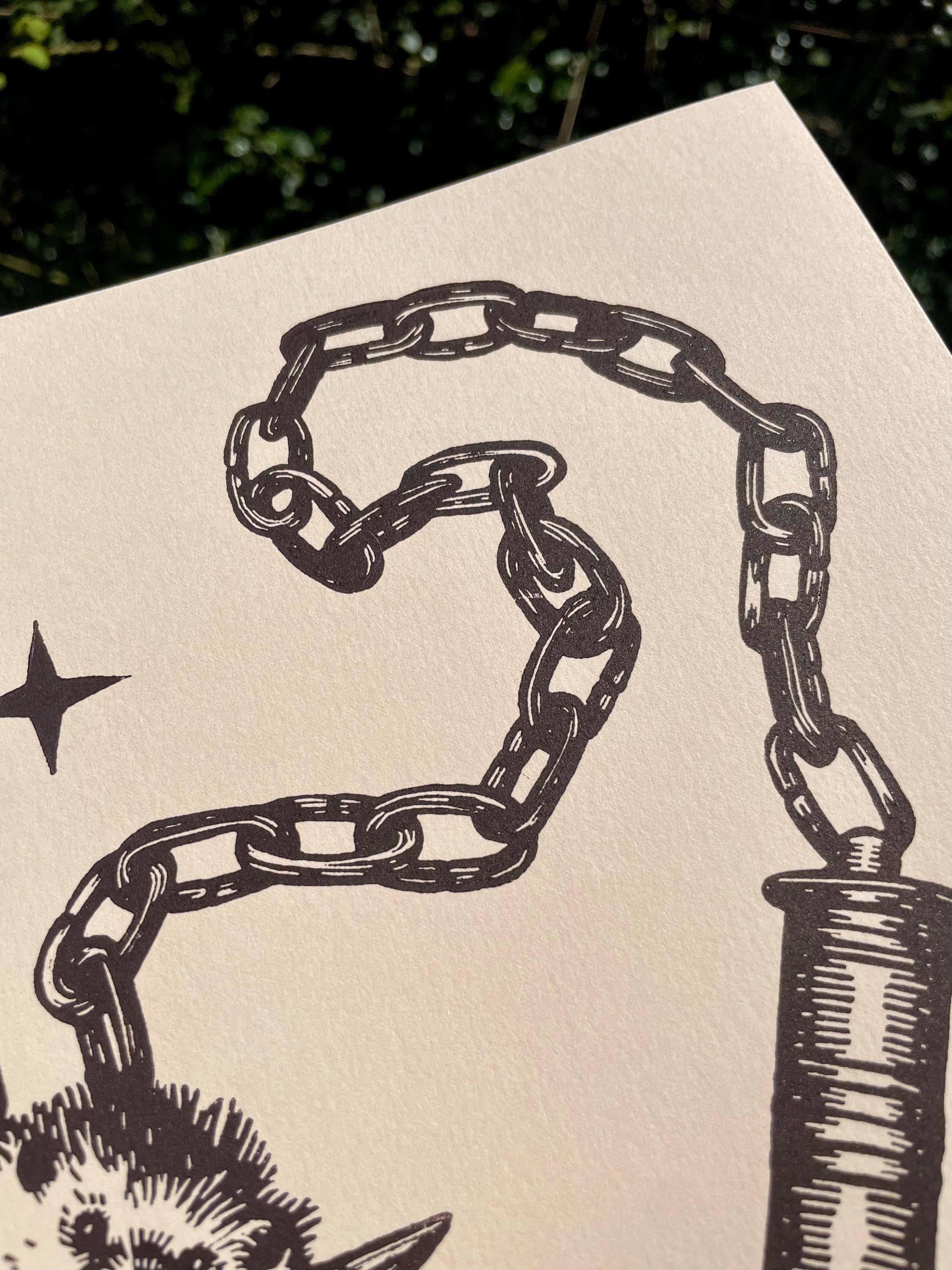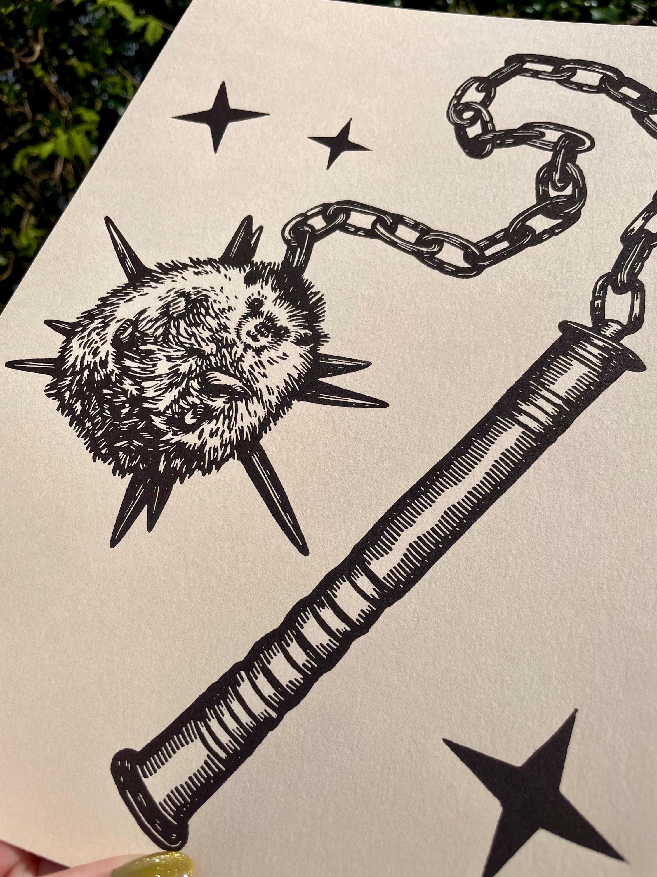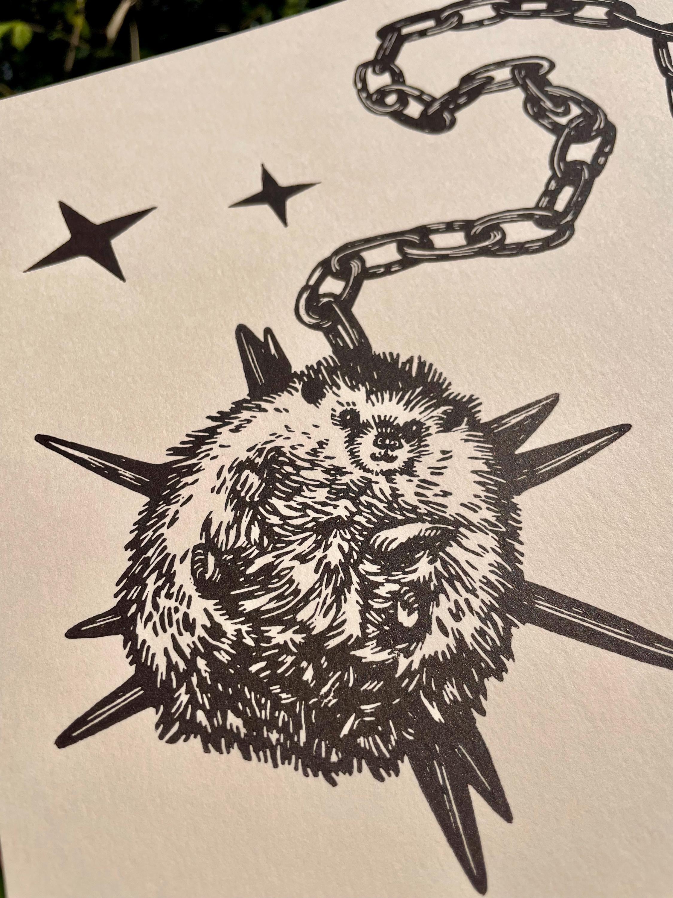 This is a 9x12" linocut print of a hedgehog flail! It is printed with Cranfield Caligo Safewash ink on Stonehenge paper in the color Fawn.